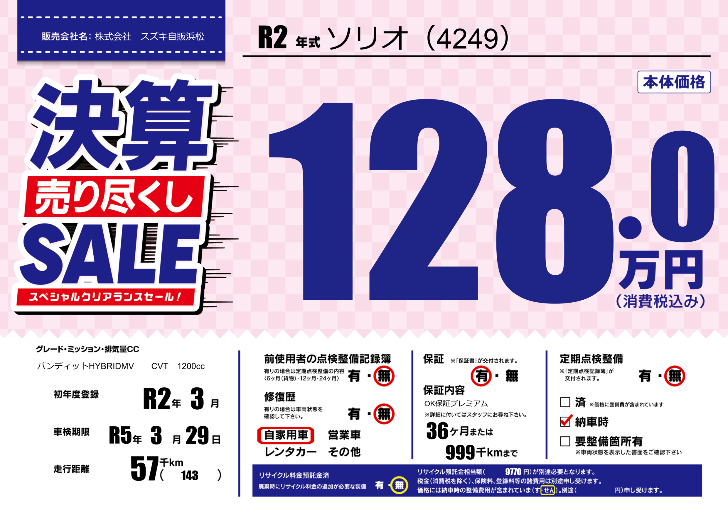 | 車名 | ソリオ(4249) | グレード ミッション 排気量 |