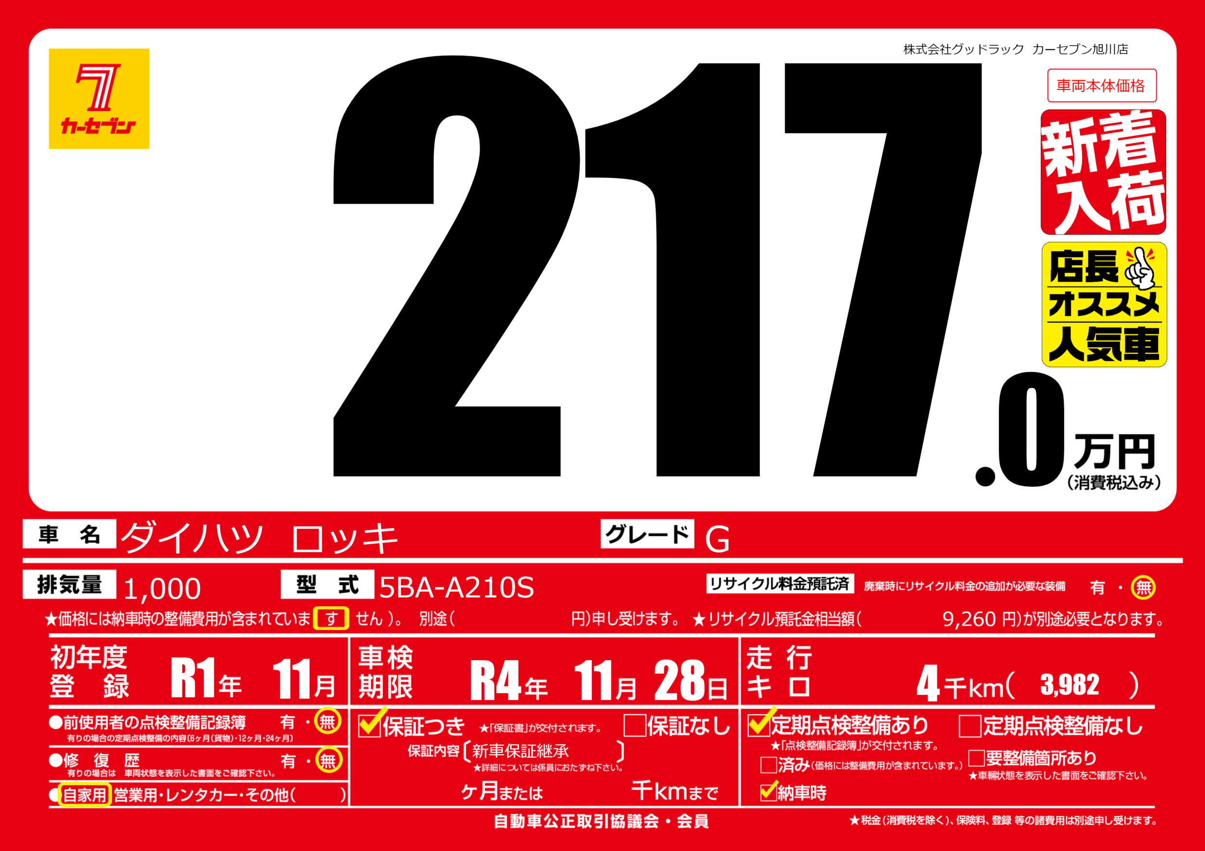 | 車名 | ダイハツ ロッキ | グレード ミッション 排気量 |