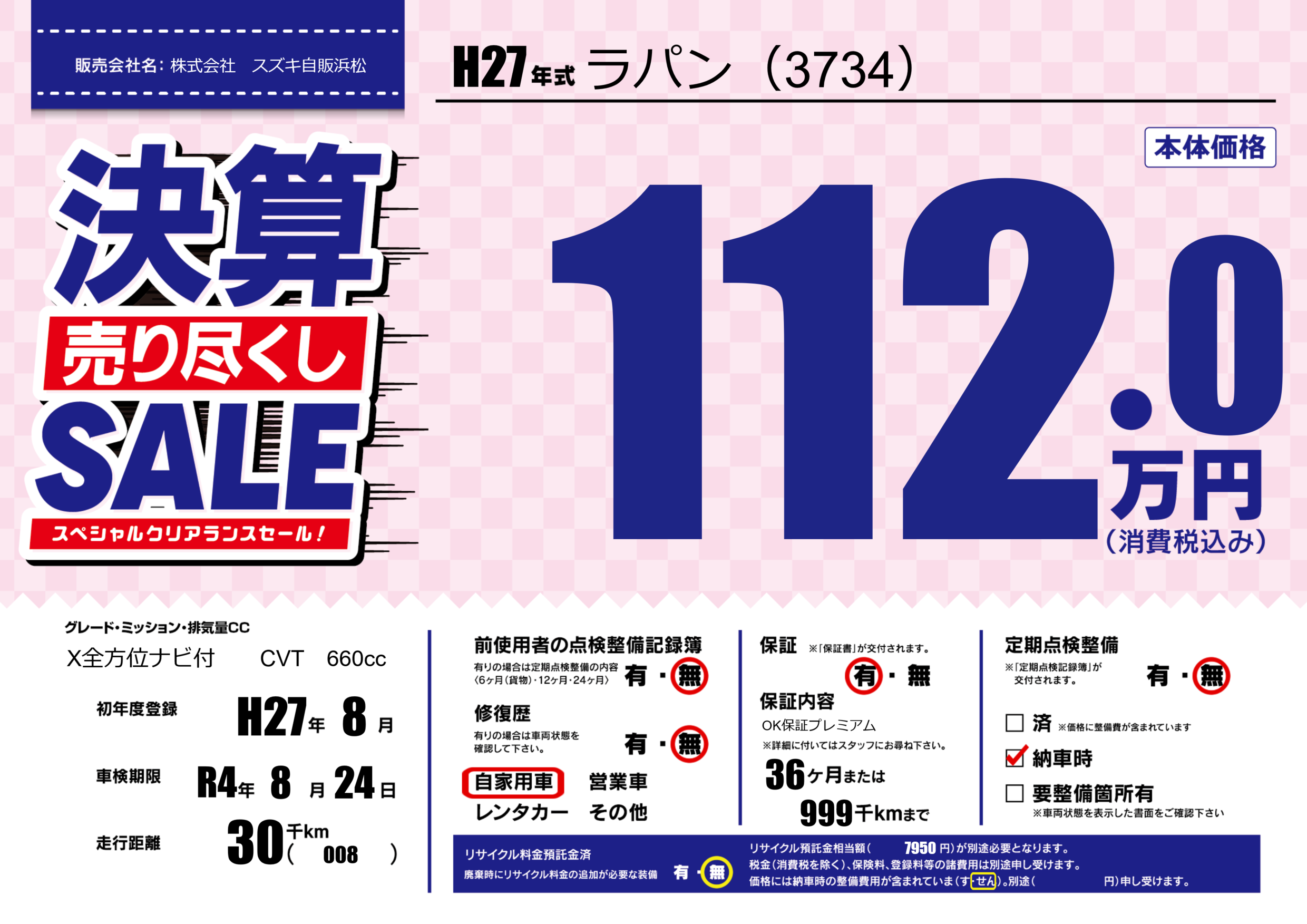| 車名 | ラパン(3734) | グレード ミッション 排気量 |