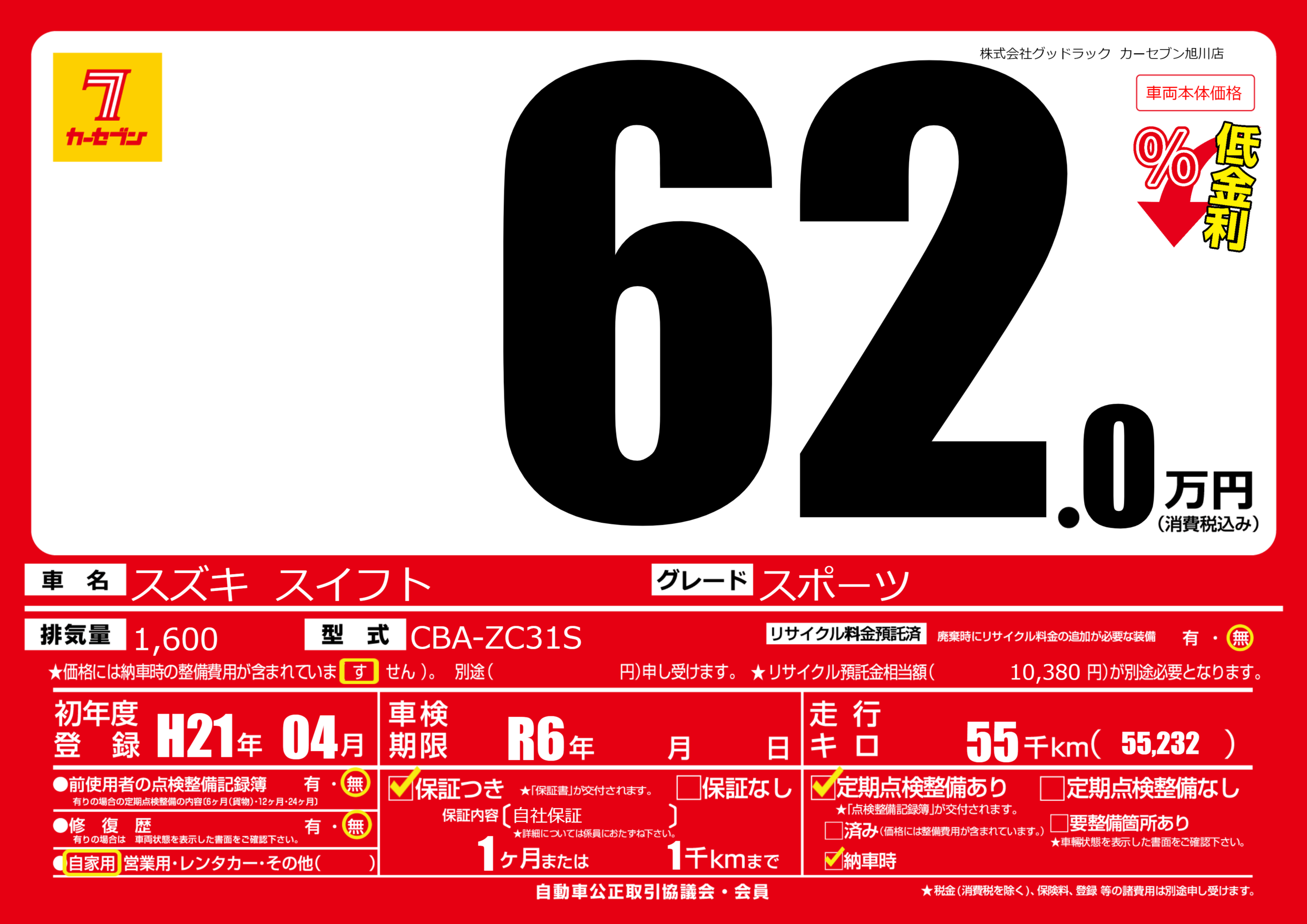 | 車名 | スズキ スイフト | グレード ミッション 排気量 |