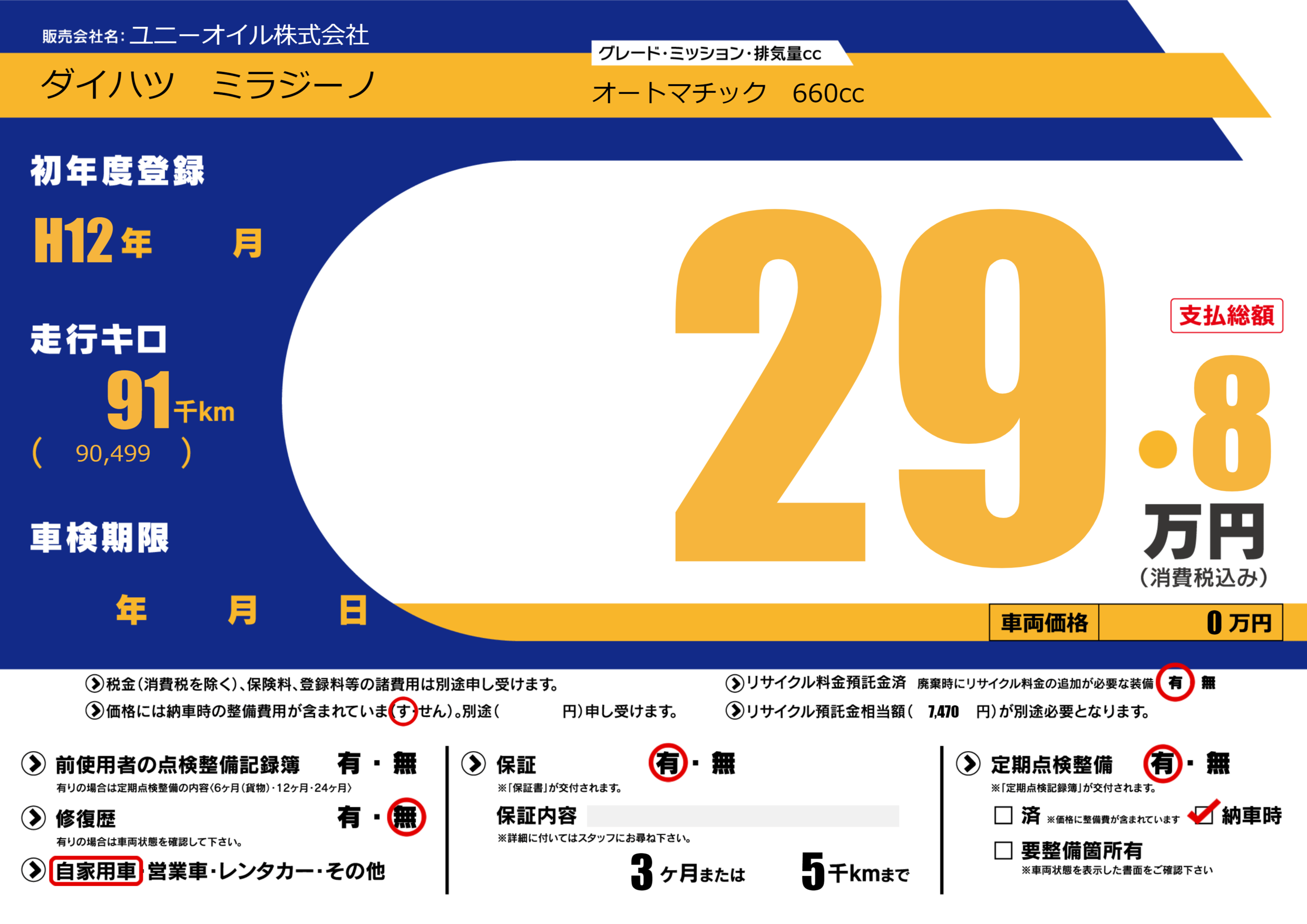 | 定期点検整備 | 定期点検整備あり 納車時あり | ||