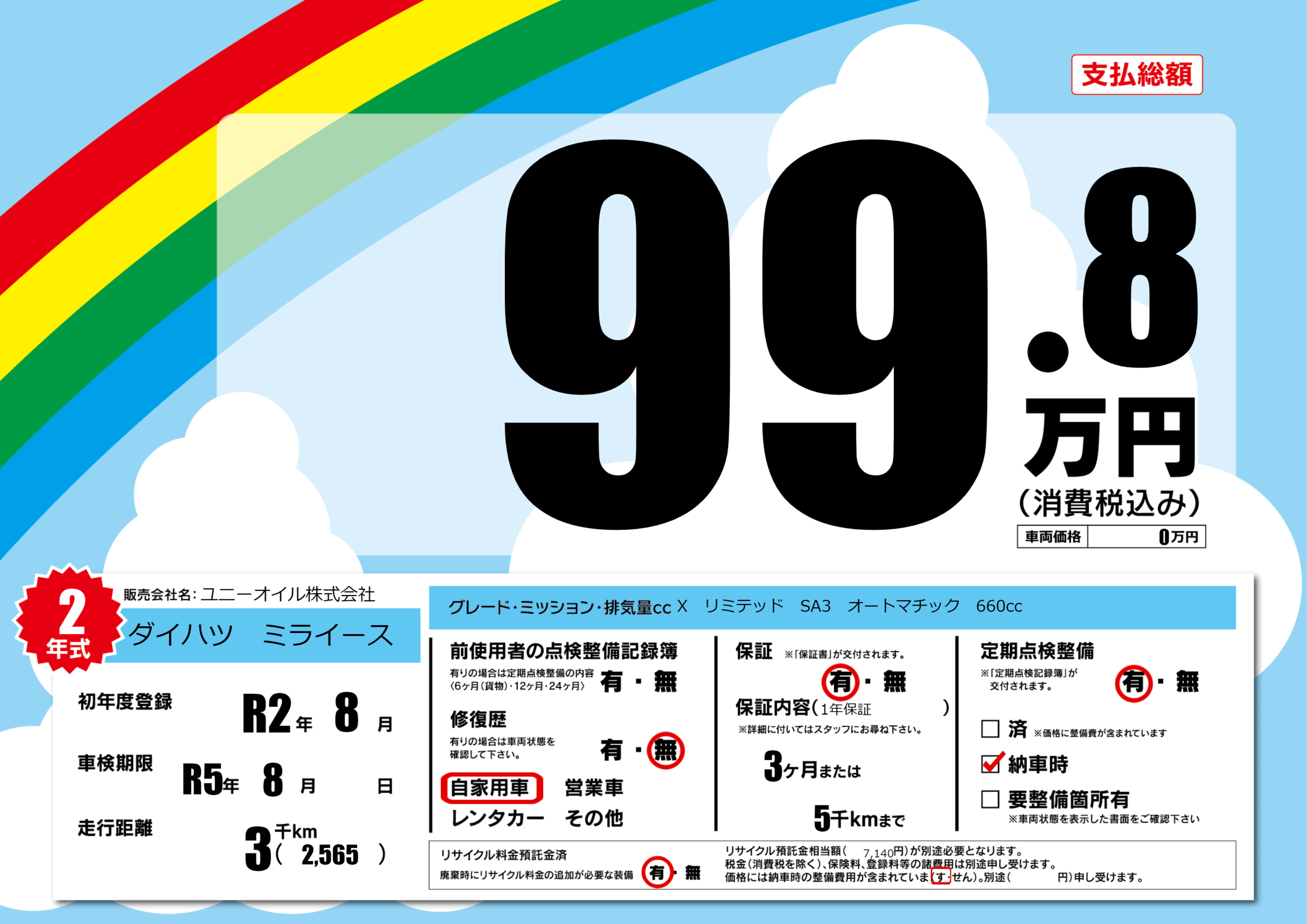 | 走行キロ | 0.3万km | 初年度登録 | R2年8月 |
