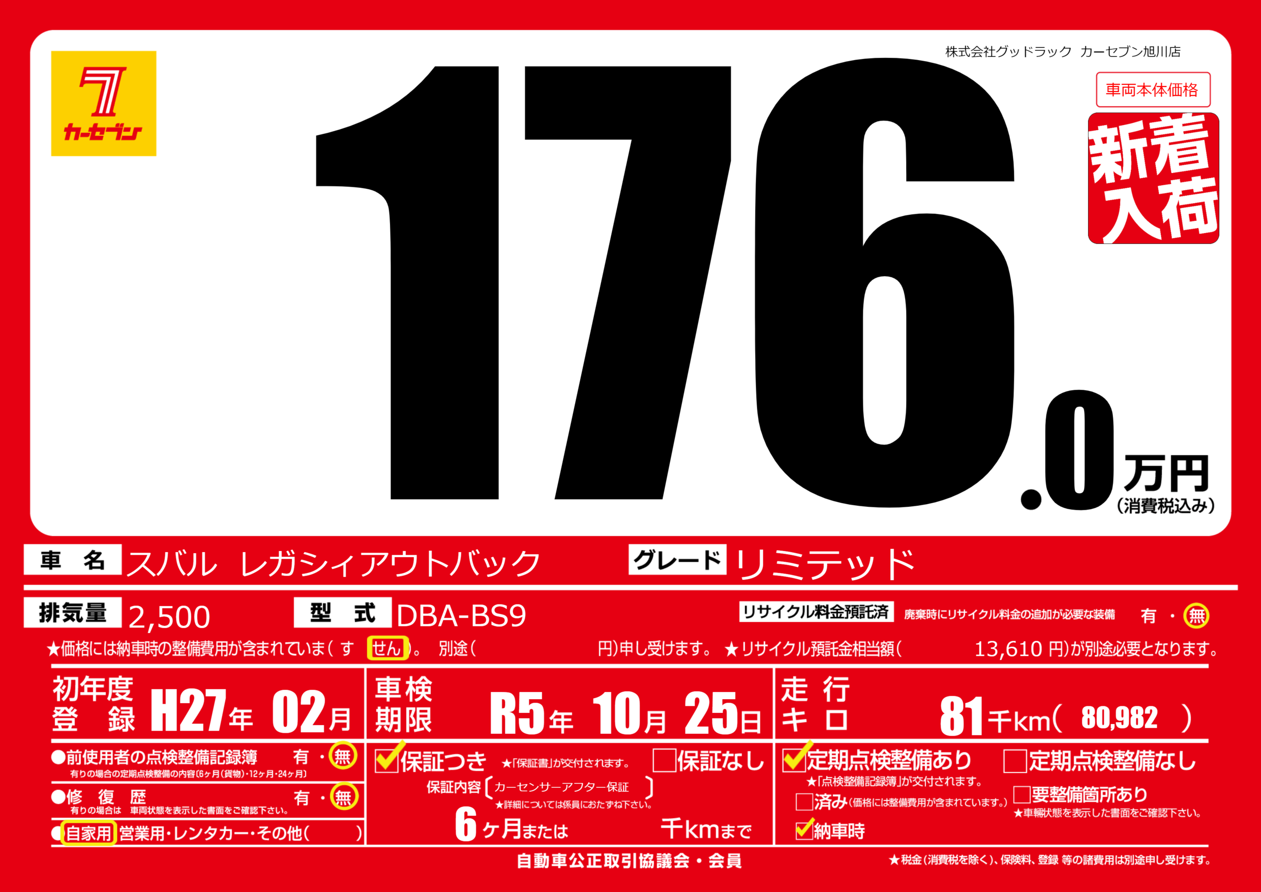 | 車名 | スバル レガシィアウトバック | グレード ミッション 排気量 |
