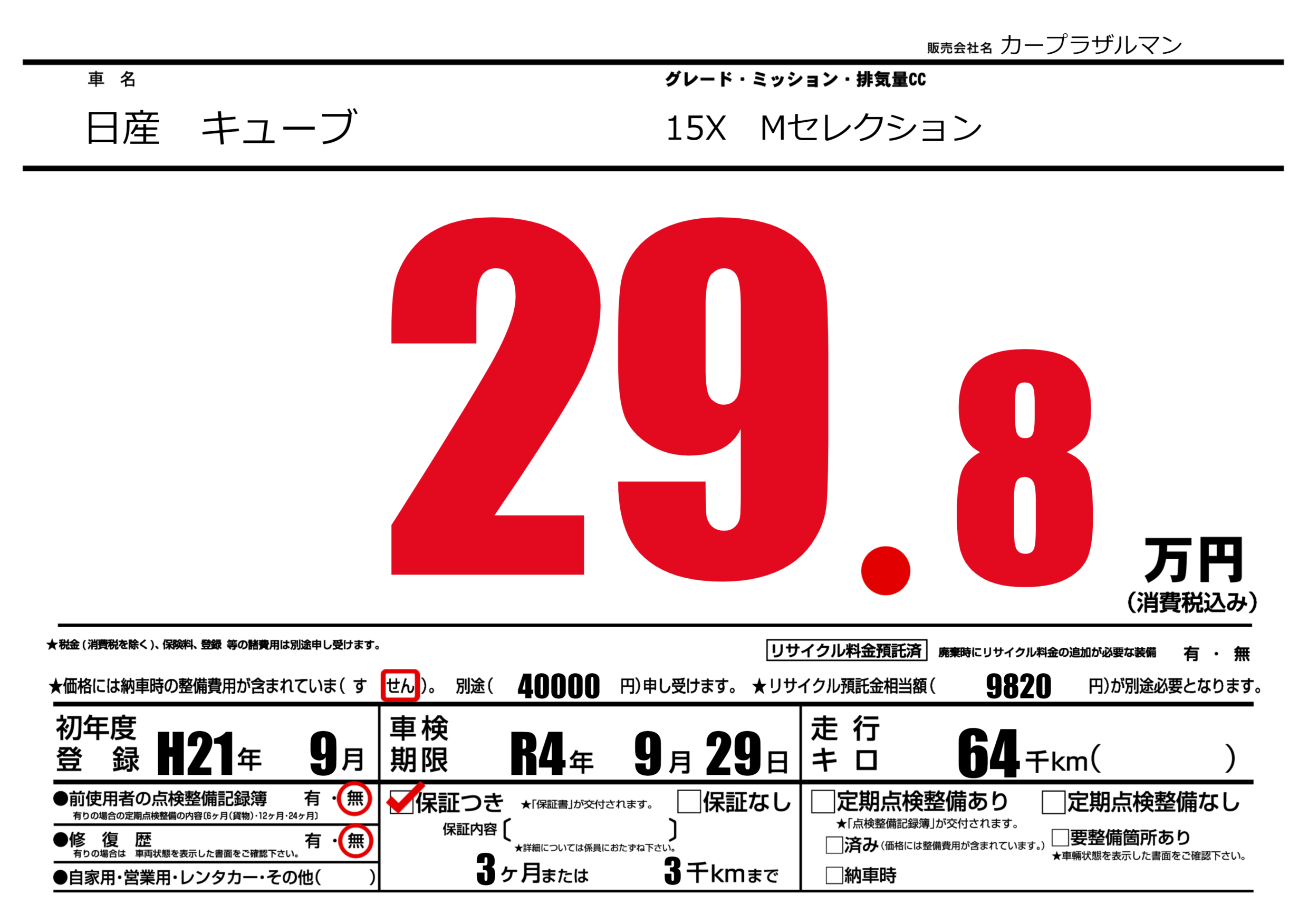 | 車名 | 日産 キューブ | グレード ミッション 排気量 |