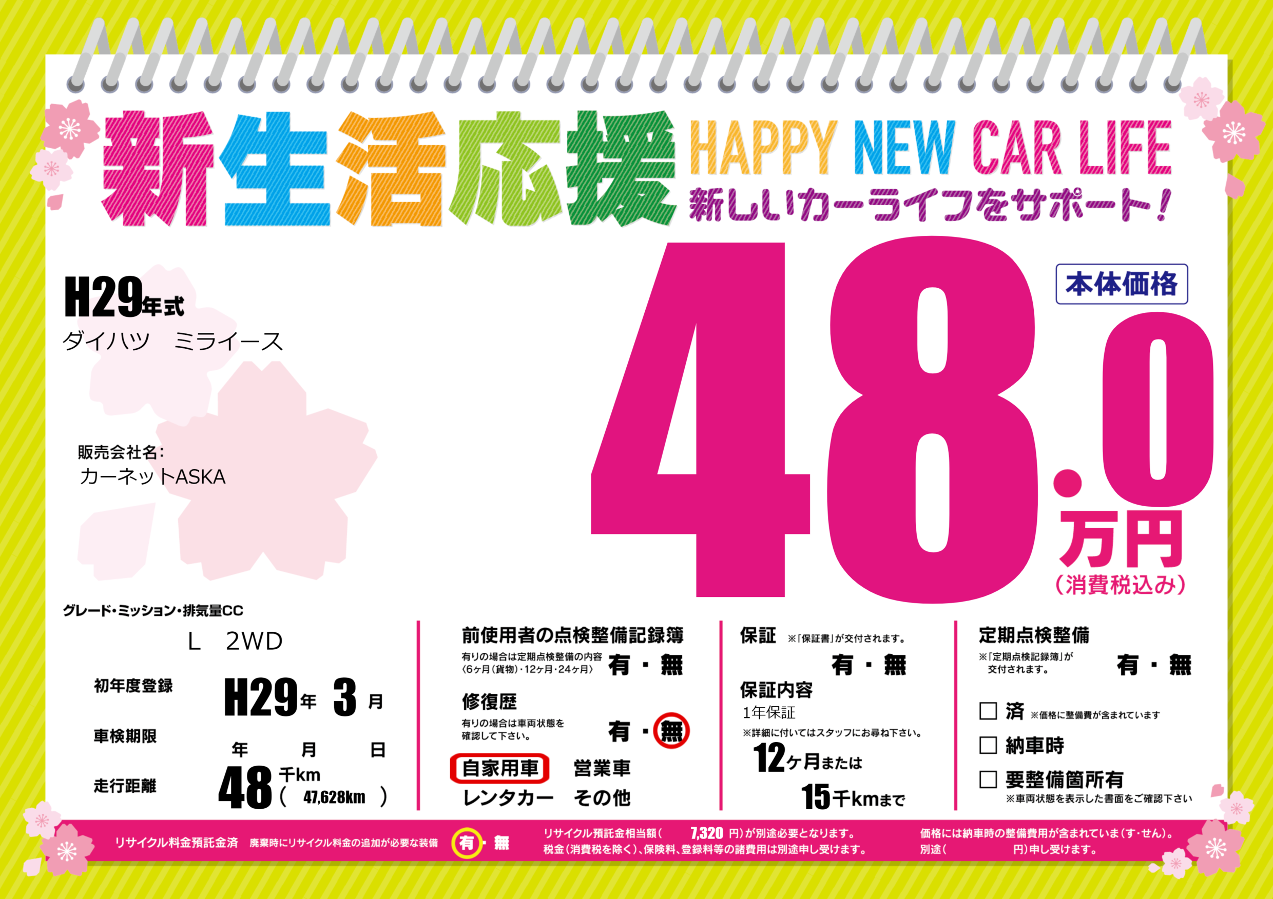 | 走行キロ | 4.8万km | 初年度登録 | H29年3月 |