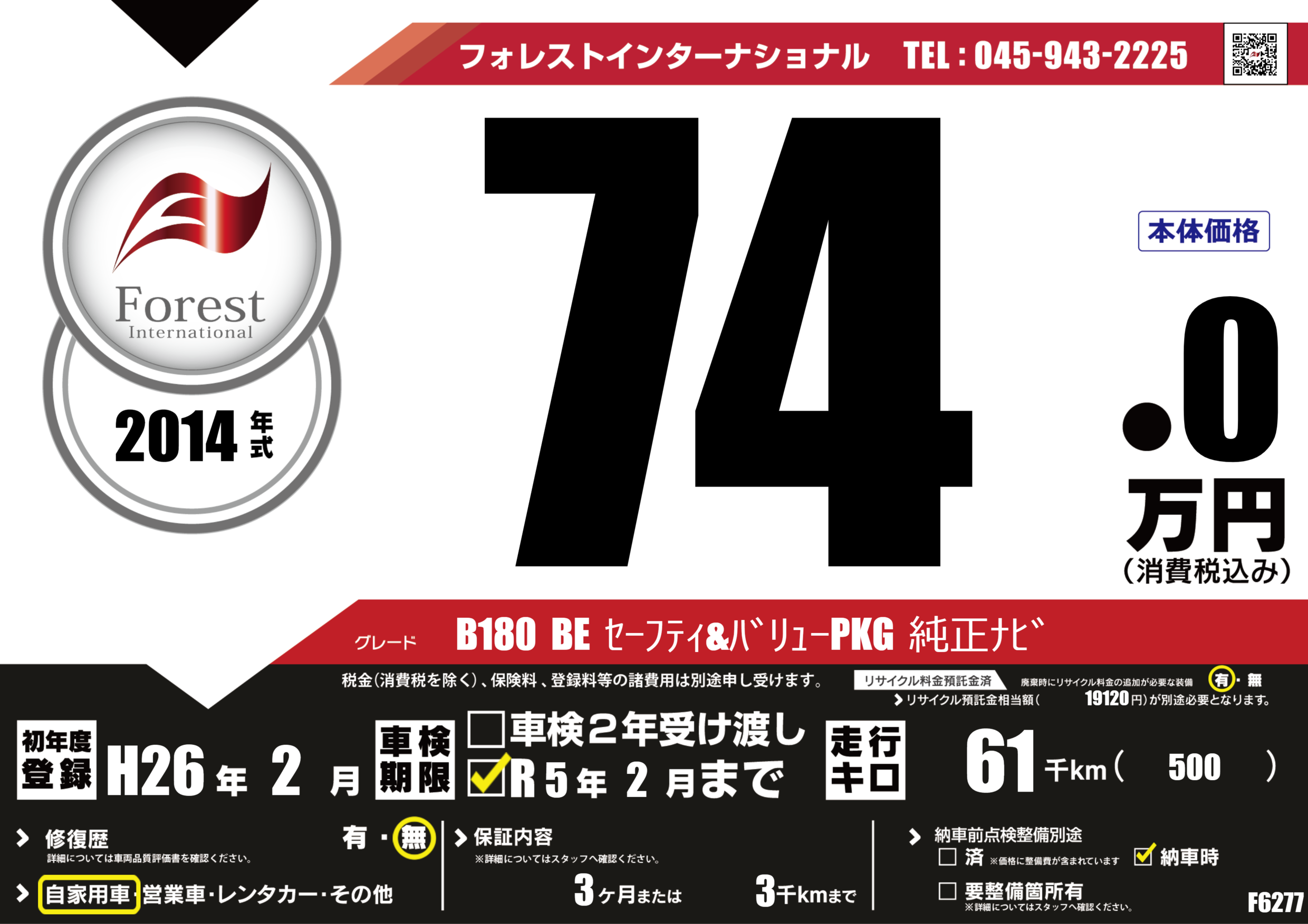 | 走行キロ | 6.1万km | 初年度登録 | H26年2月 |