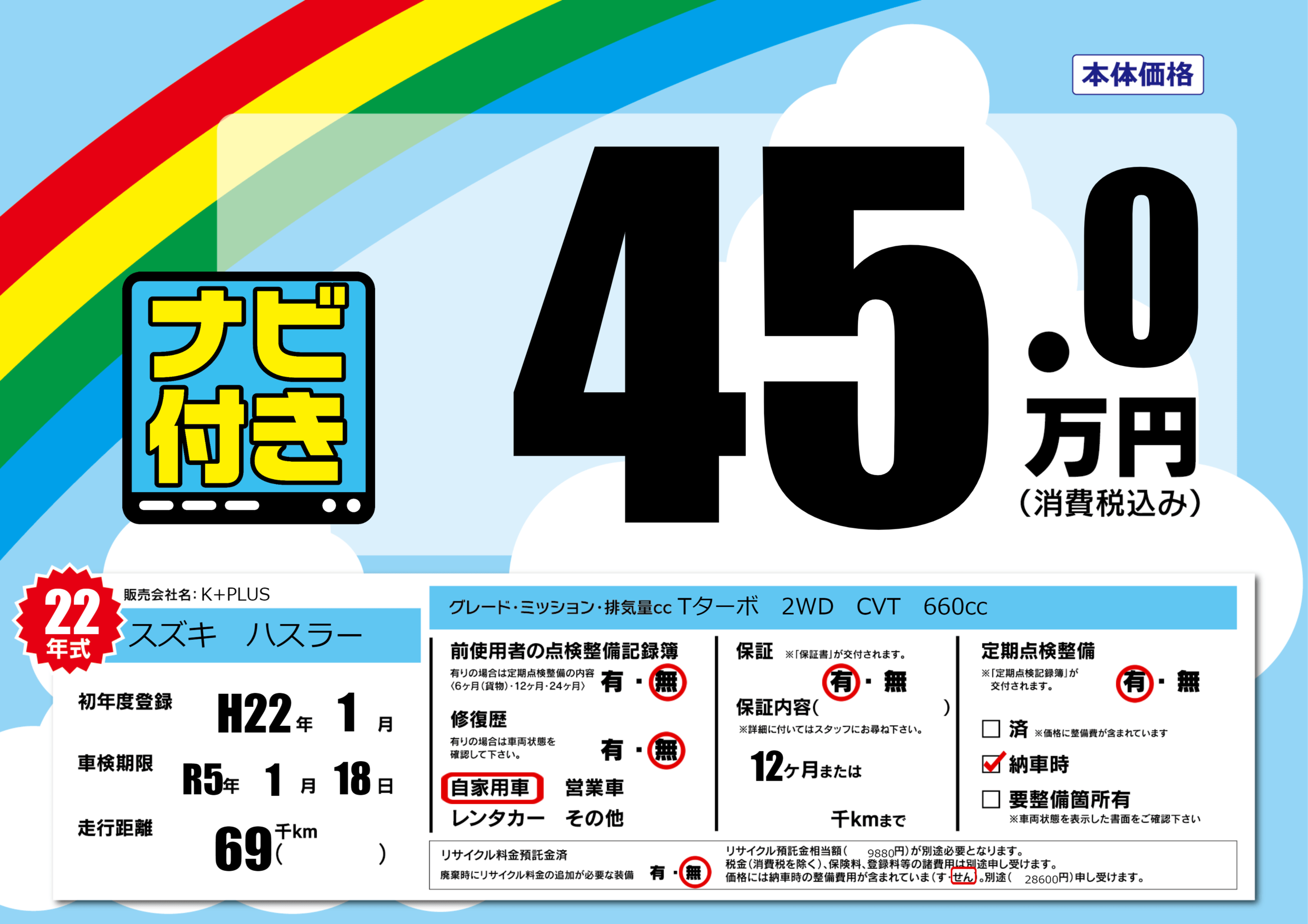 | 走行キロ | 6.9万km | 初年度登録 | H22年1月 |