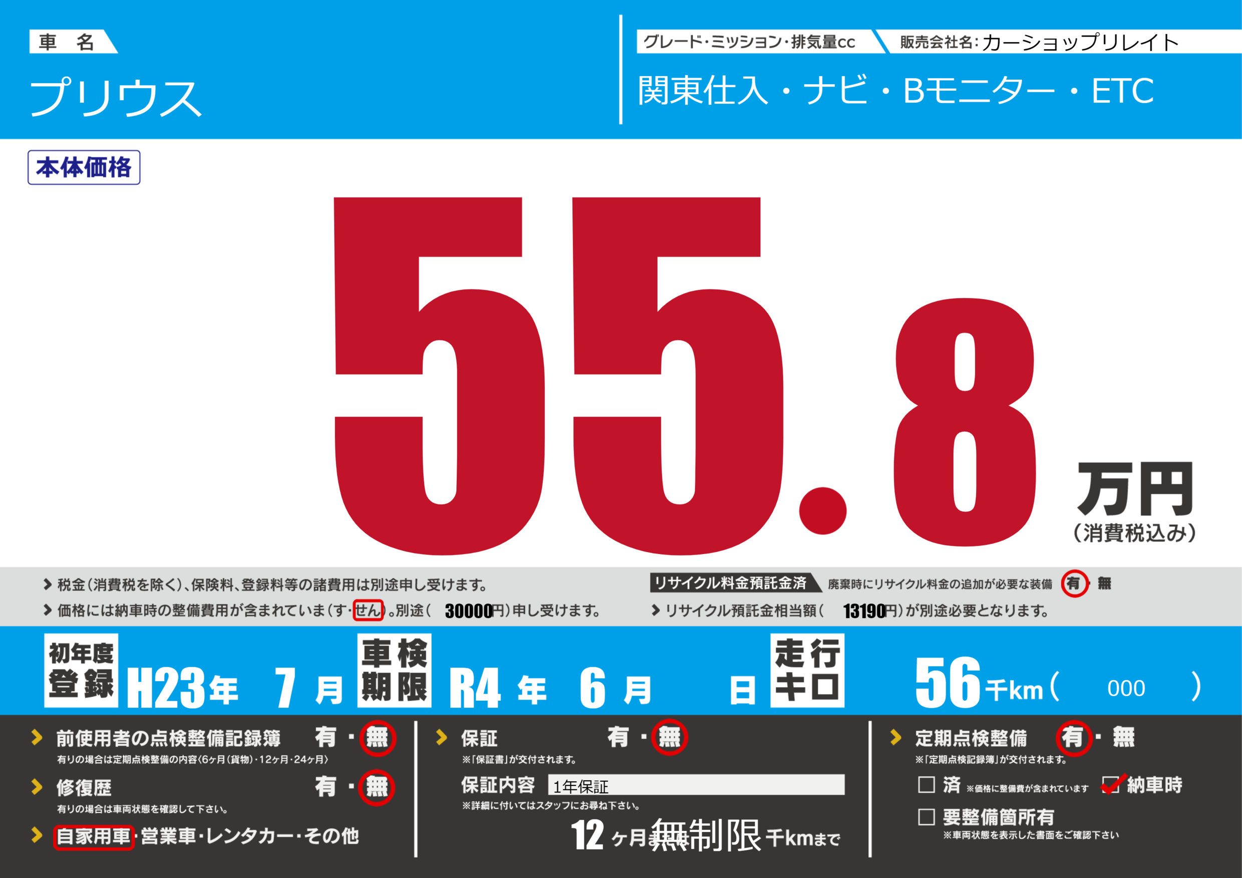 | 車名 | プリウス | グレード ミッション 排気量 |