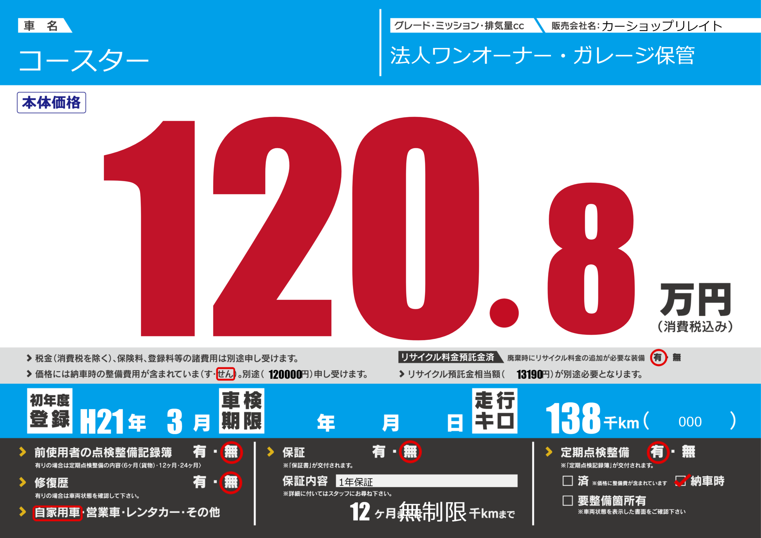 | 走行キロ | 13.8万km | 初年度登録 | H21年3月 |
