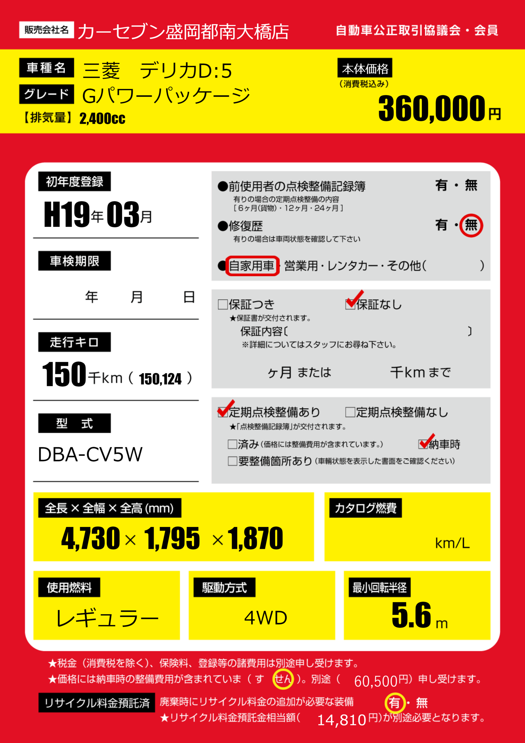 | 車名 | 三菱 デリカD:5 | グレード ミッション 排気量 |