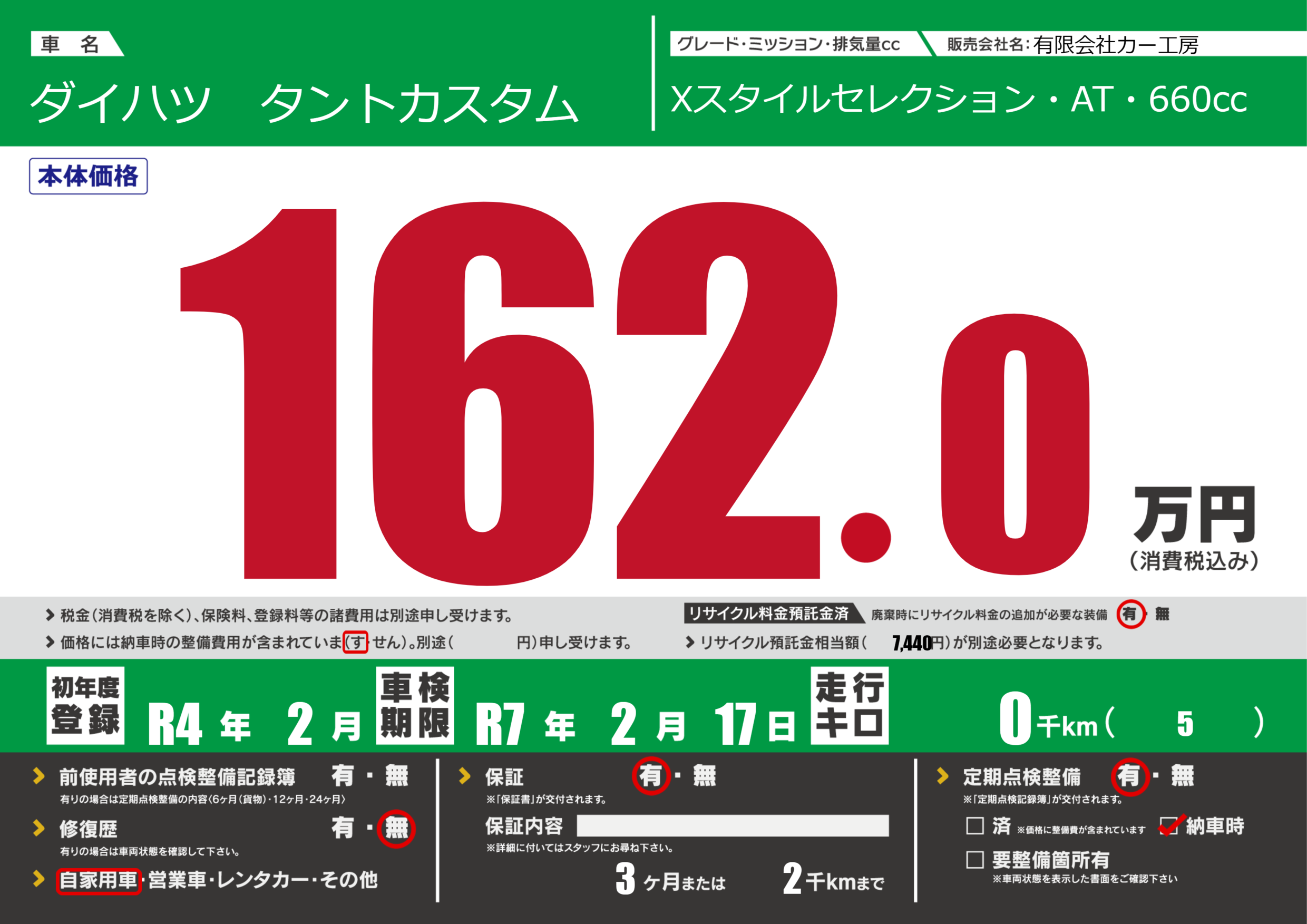 保証付き 保証内容(---) 3ヶ月または(2)千kmまで |