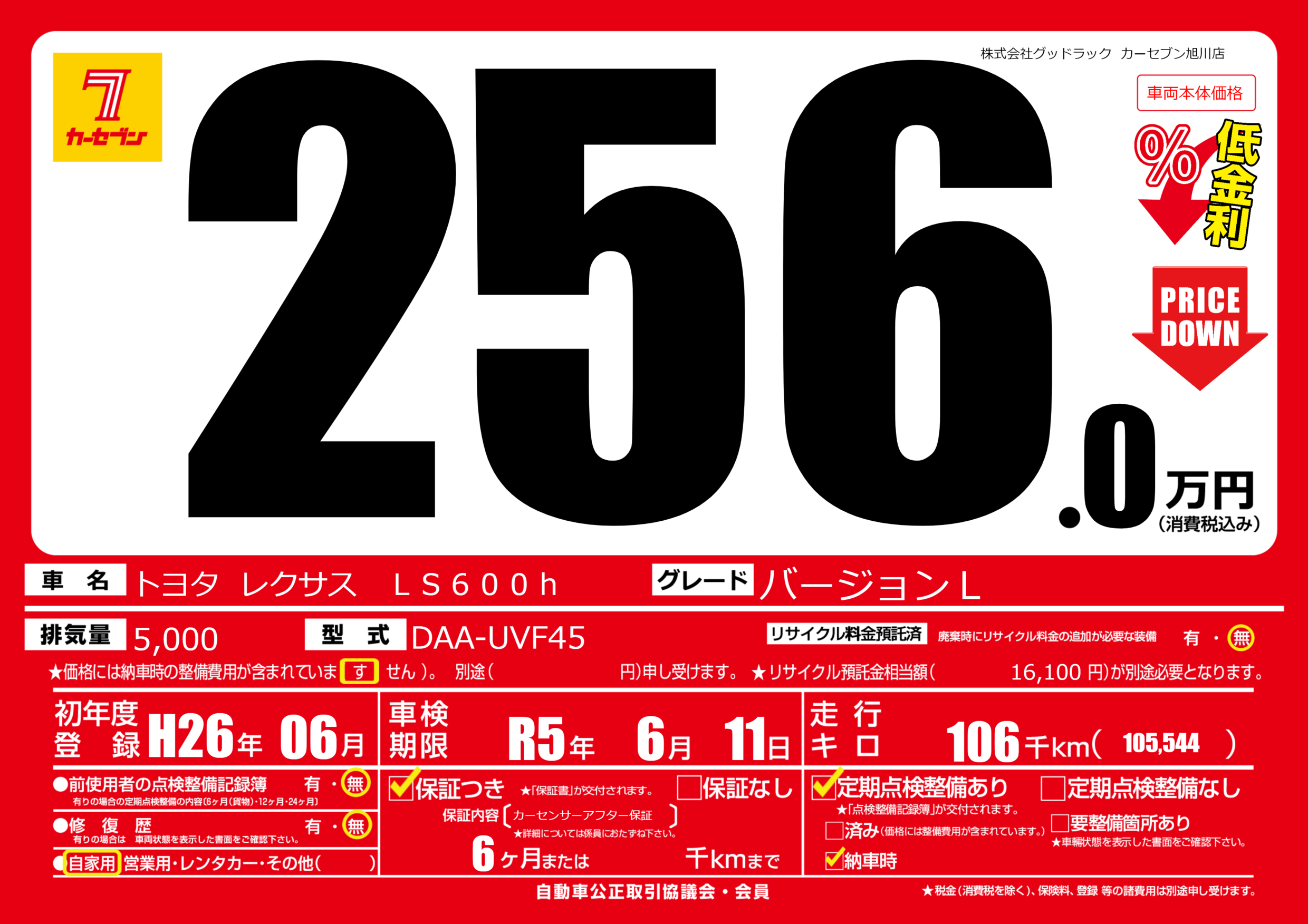 | 車名 | トヨタ レクサス LS600h | グレード ミッション 排気量 |