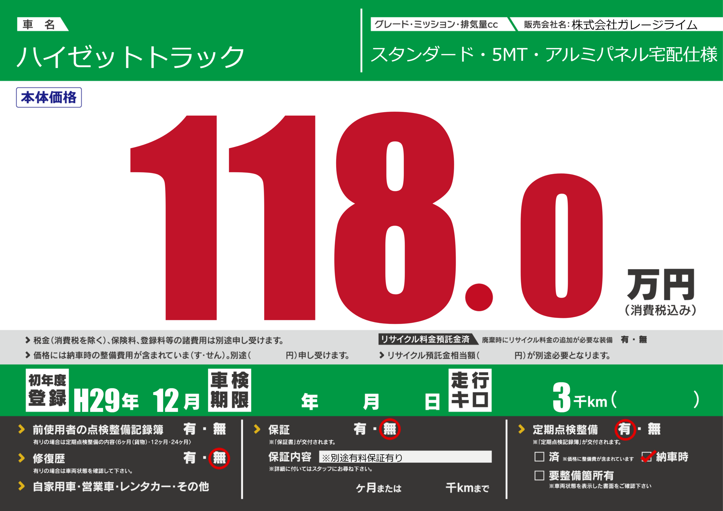 保証なし 保証内容(※別途有料保証有り) ---ヶ月または()千kmまで |