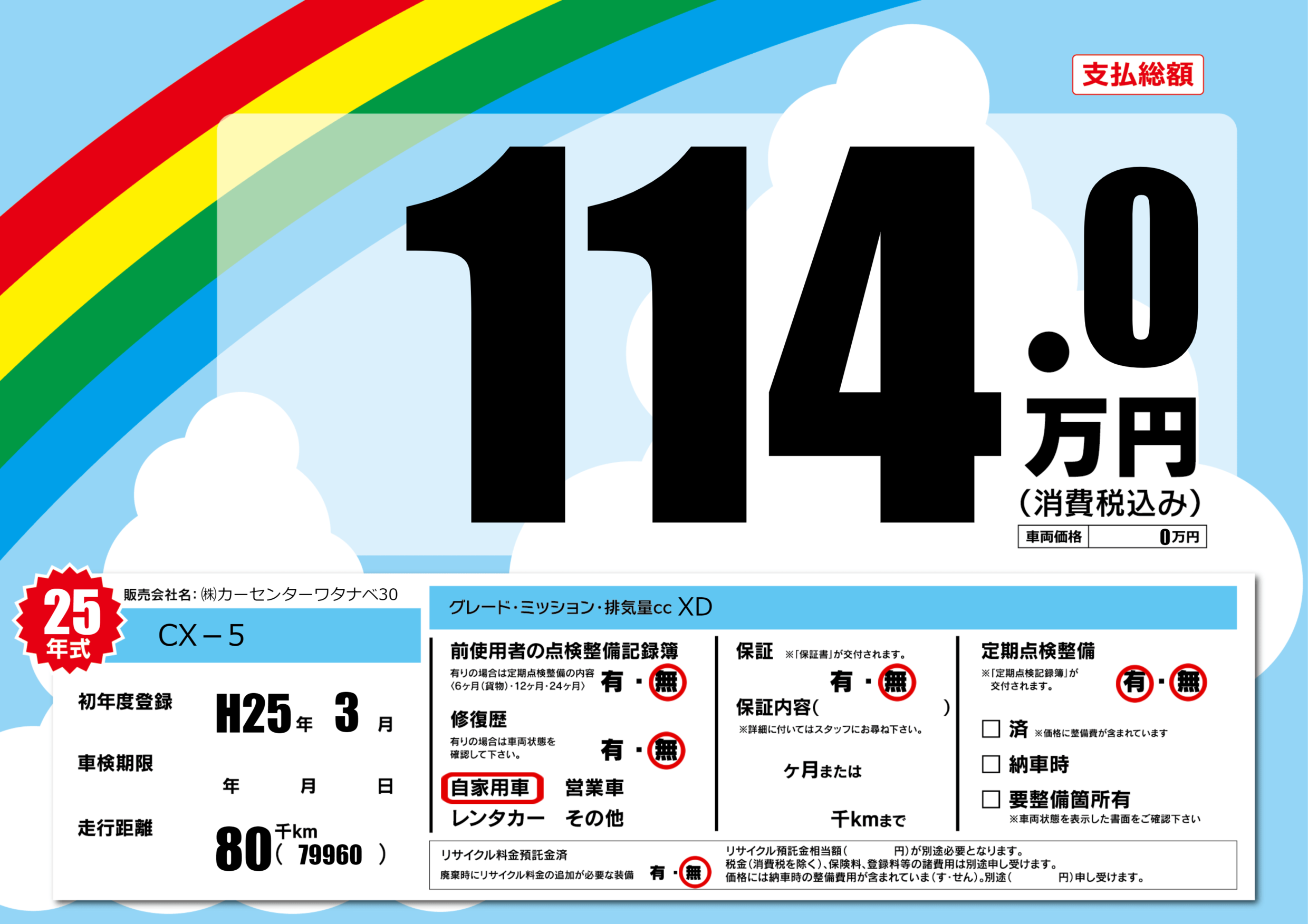 | 走行キロ | 8万km | 初年度登録 | H25年3月 |
