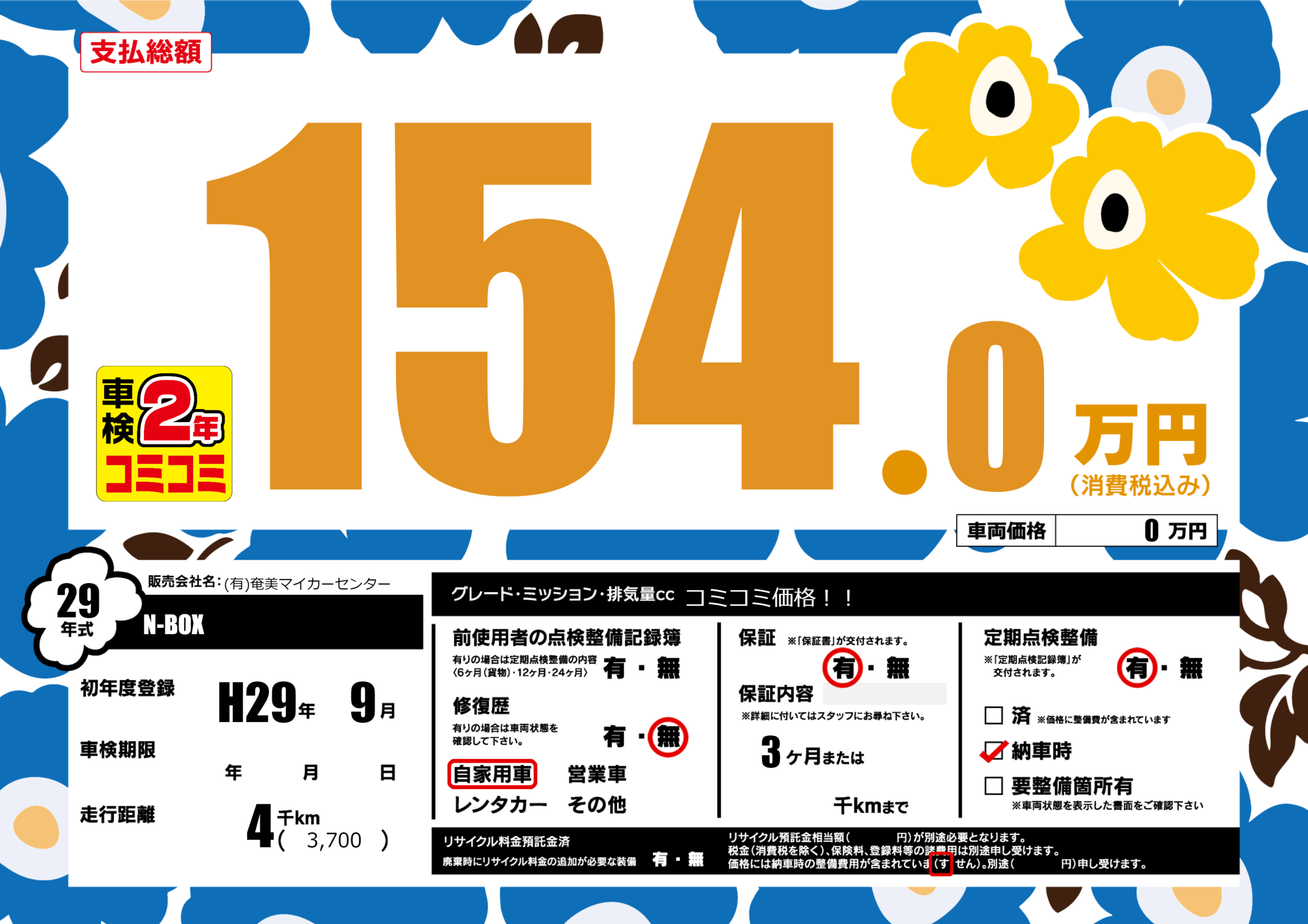 | 走行キロ | 0.4万km | 初年度登録 | H29年9月 |