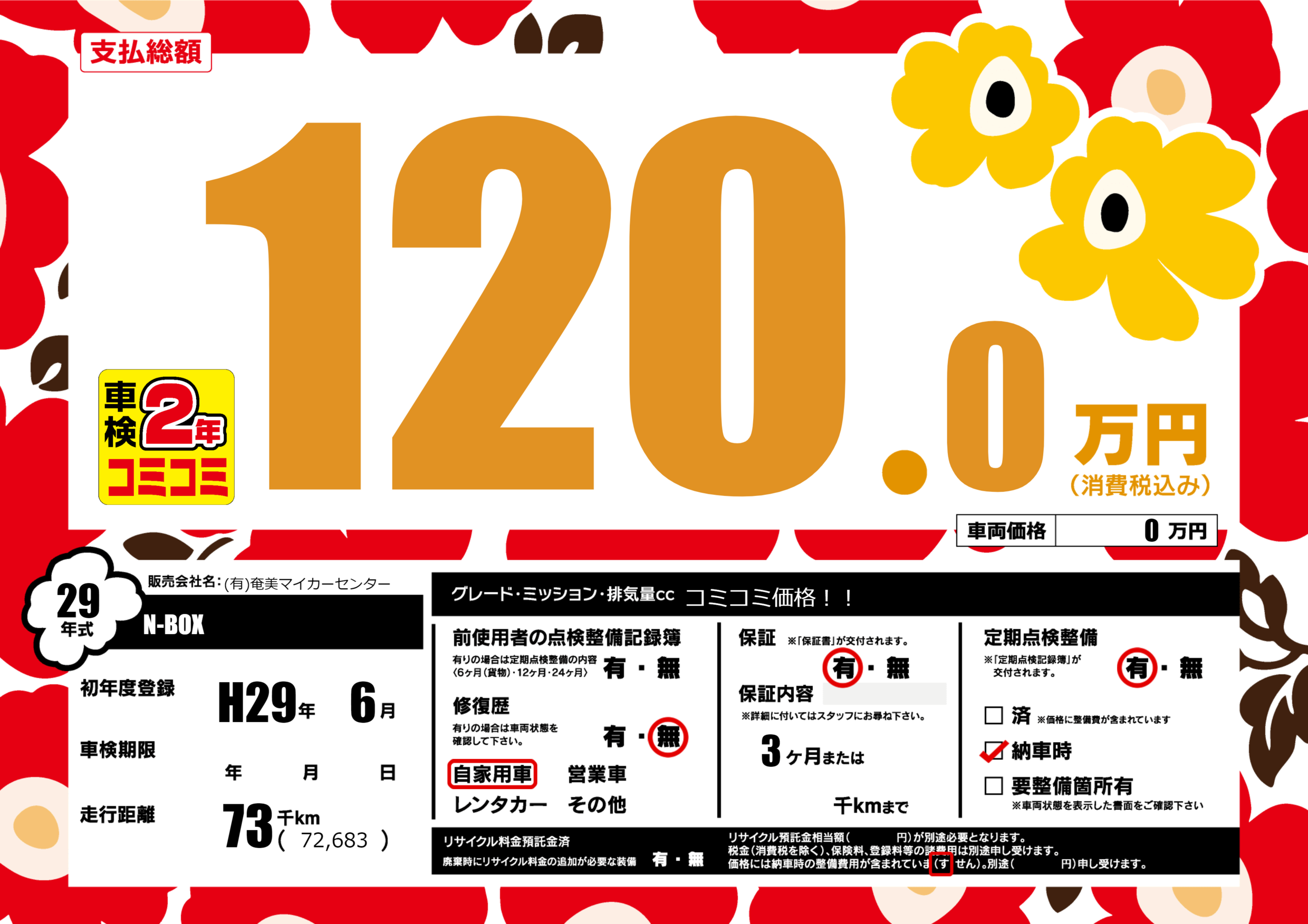 | 走行キロ | 7.3万km | 初年度登録 | H29年6月 |