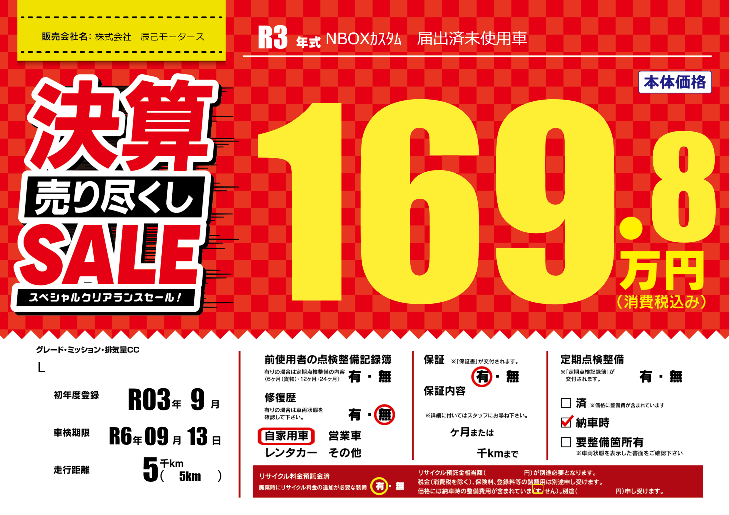| 走行キロ | 0.5万km | 初年度登録 | R03年9月 |
