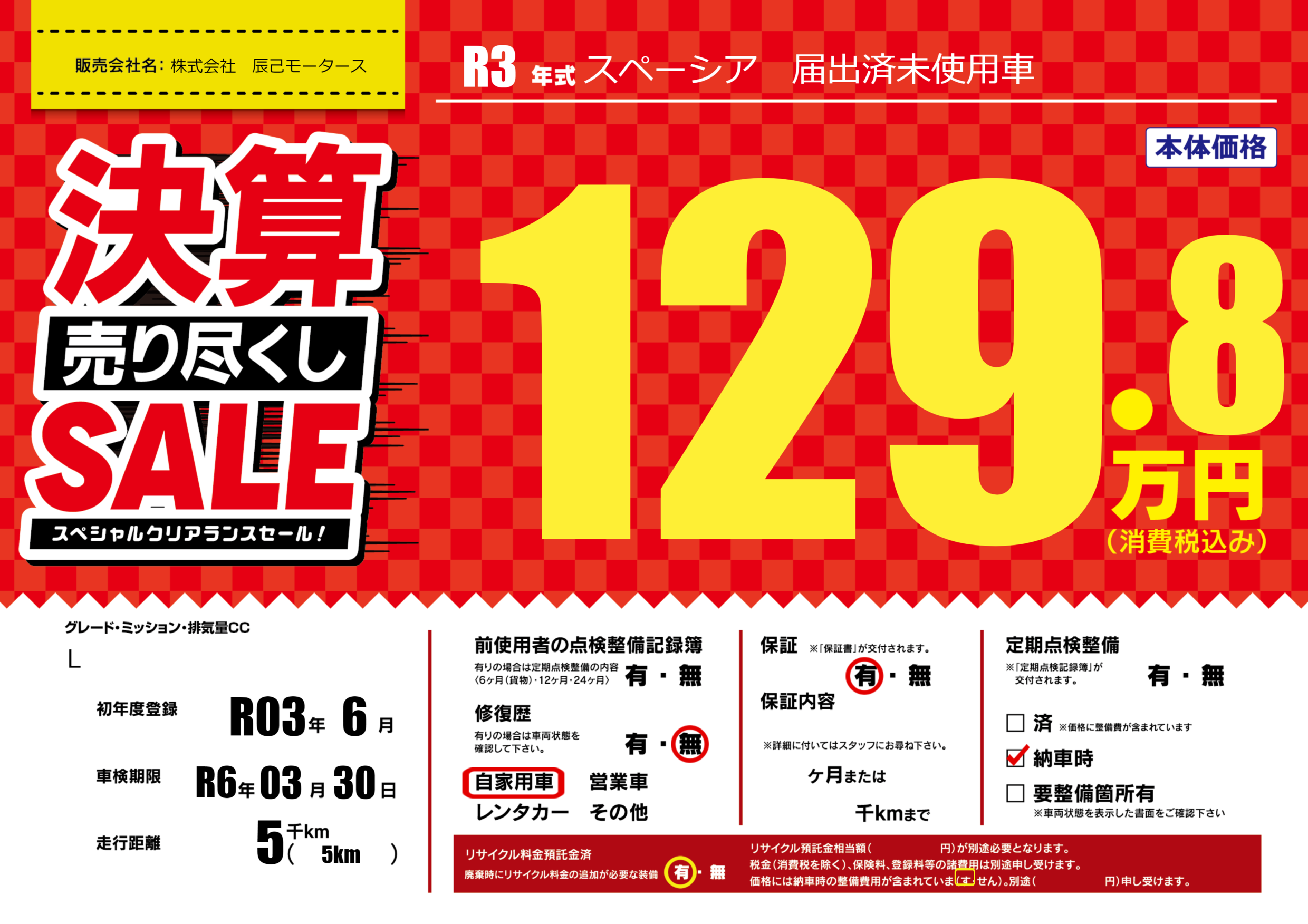 | 走行キロ | 0.5万km | 初年度登録 | R03年6月 |