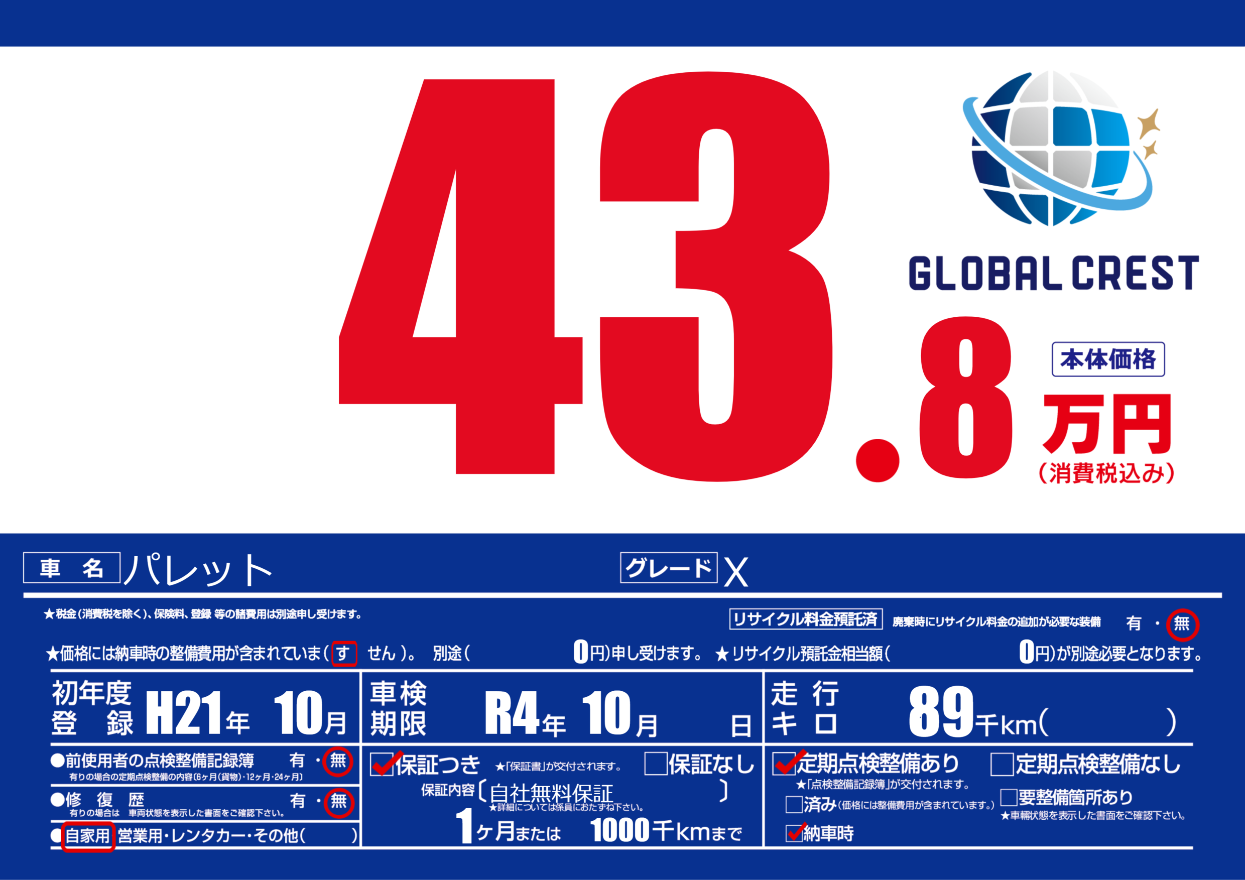 | 走行キロ | 8.9万km | 初年度登録 | H21年10月 |