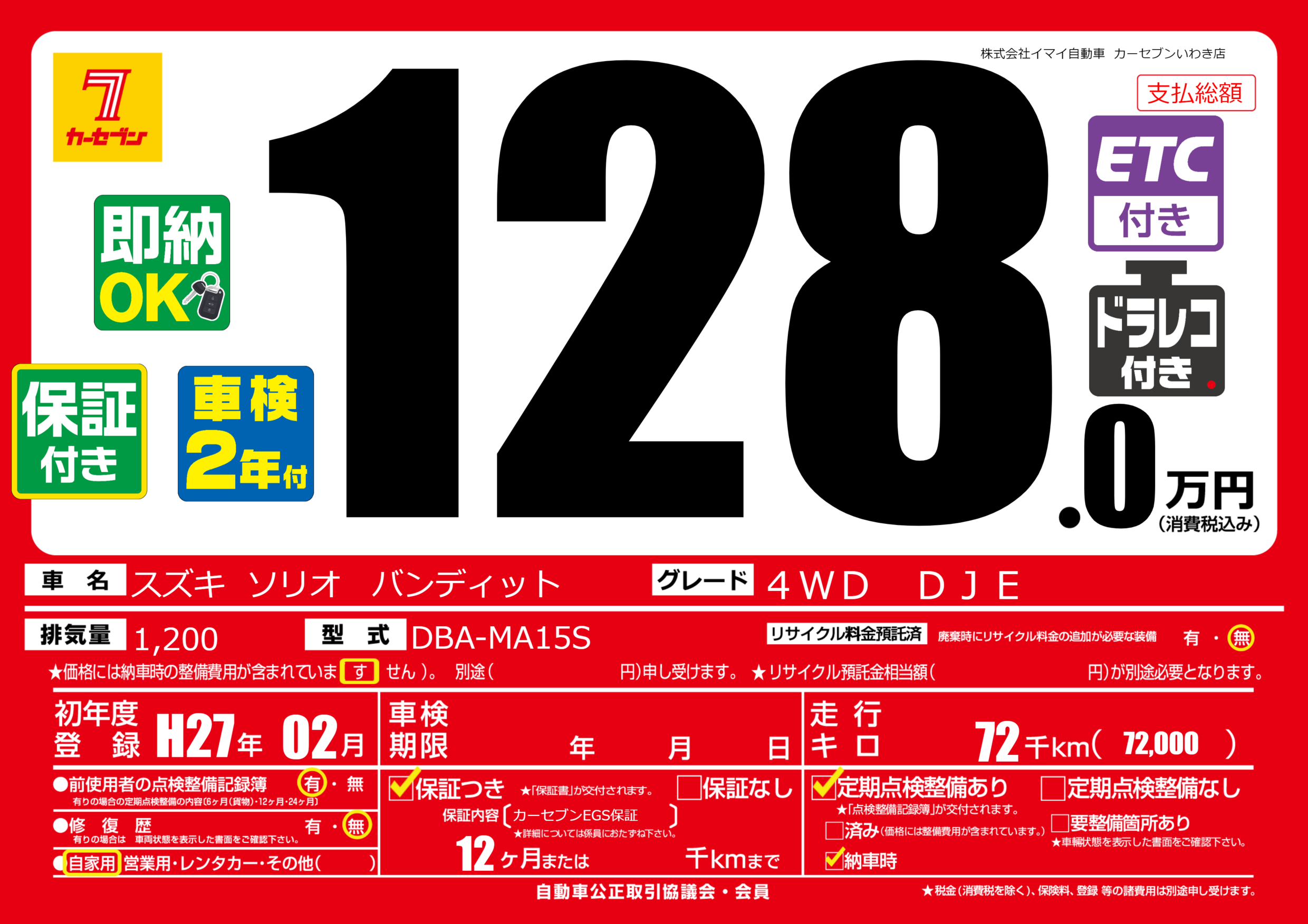 | 車名 | スズキ ソリオ バンディット | グレード ミッション 排気量 |