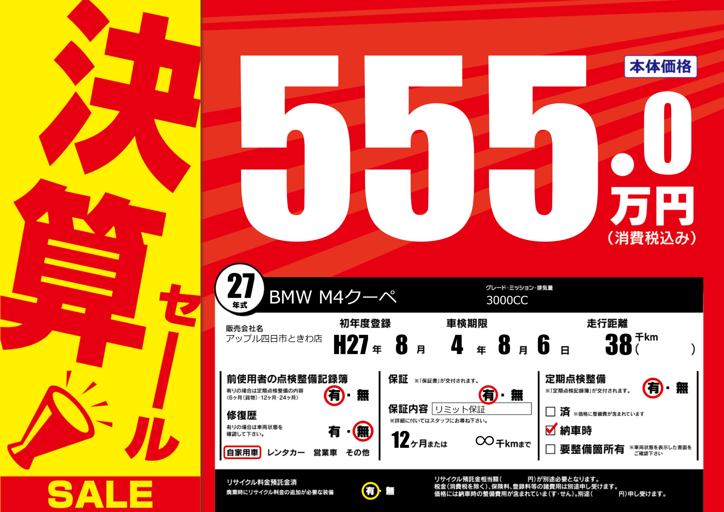 | 車名 | BMW M4クーペ | グレード ミッション 排気量 |