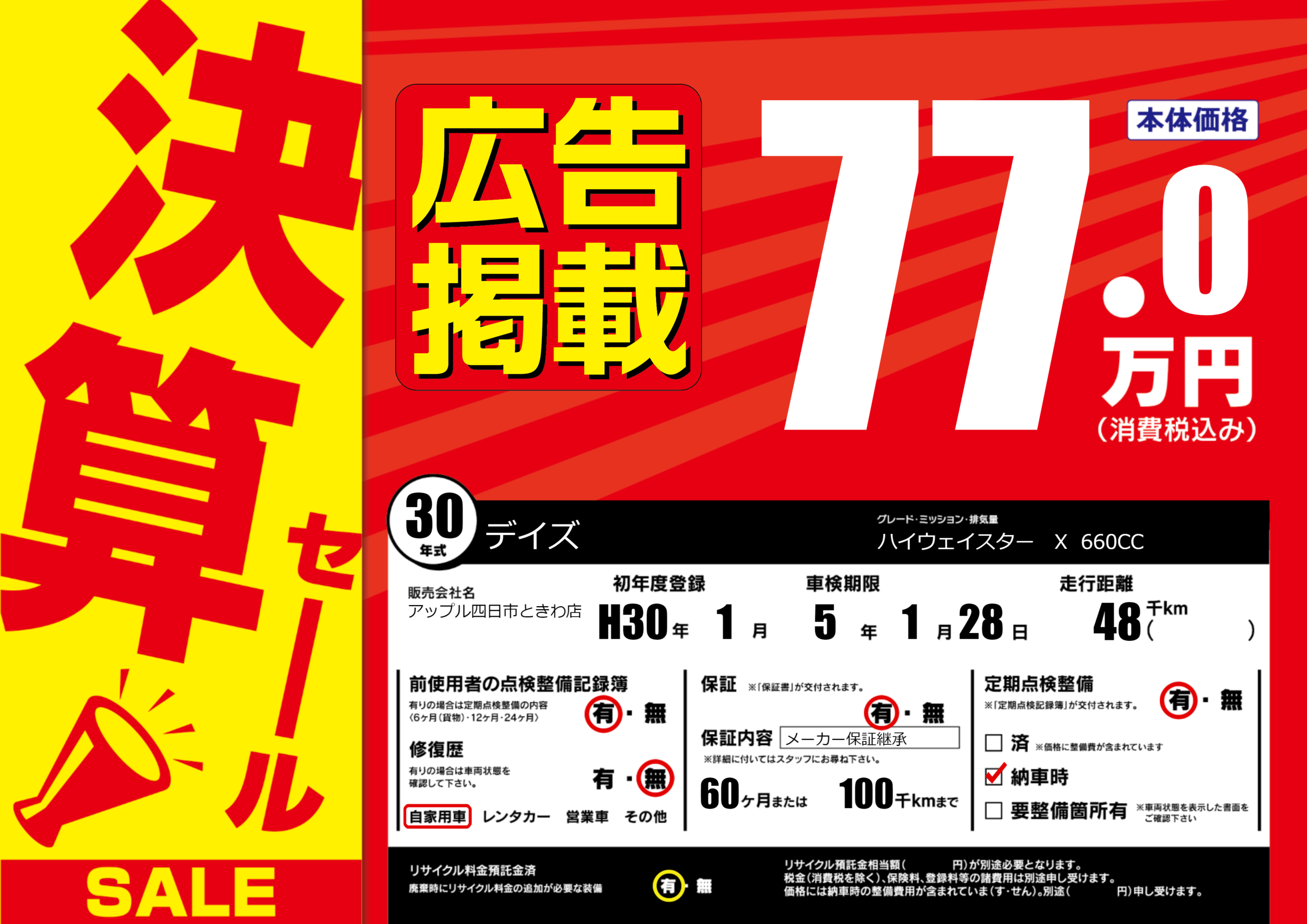 | 定期点検整備 | 定期点検整備あり 納車時あり | ||