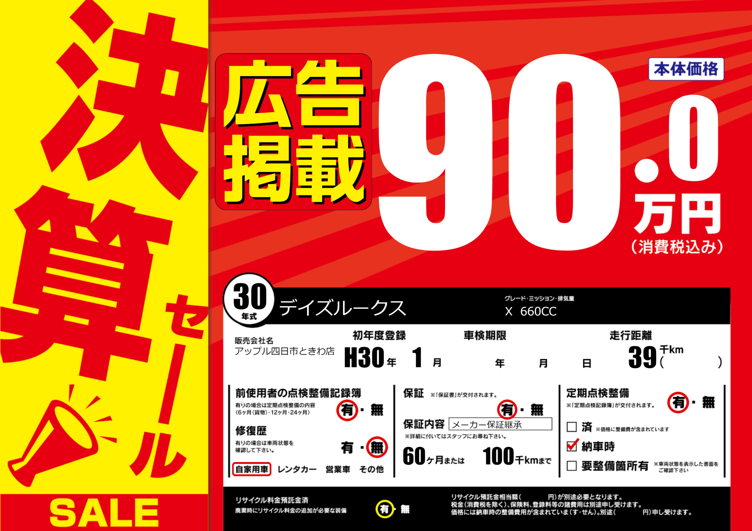 | 定期点検整備 | 定期点検整備あり 納車時あり | ||