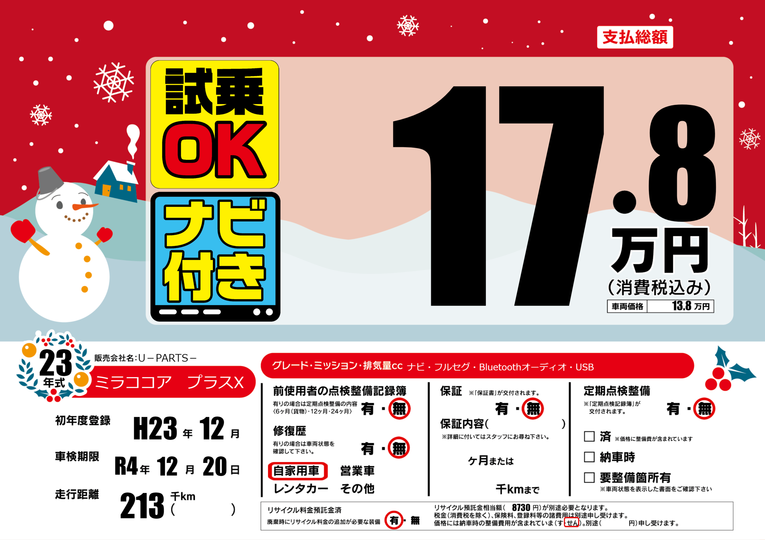 | 走行キロ | 21.3万km | 初年度登録 | H23年12月 |