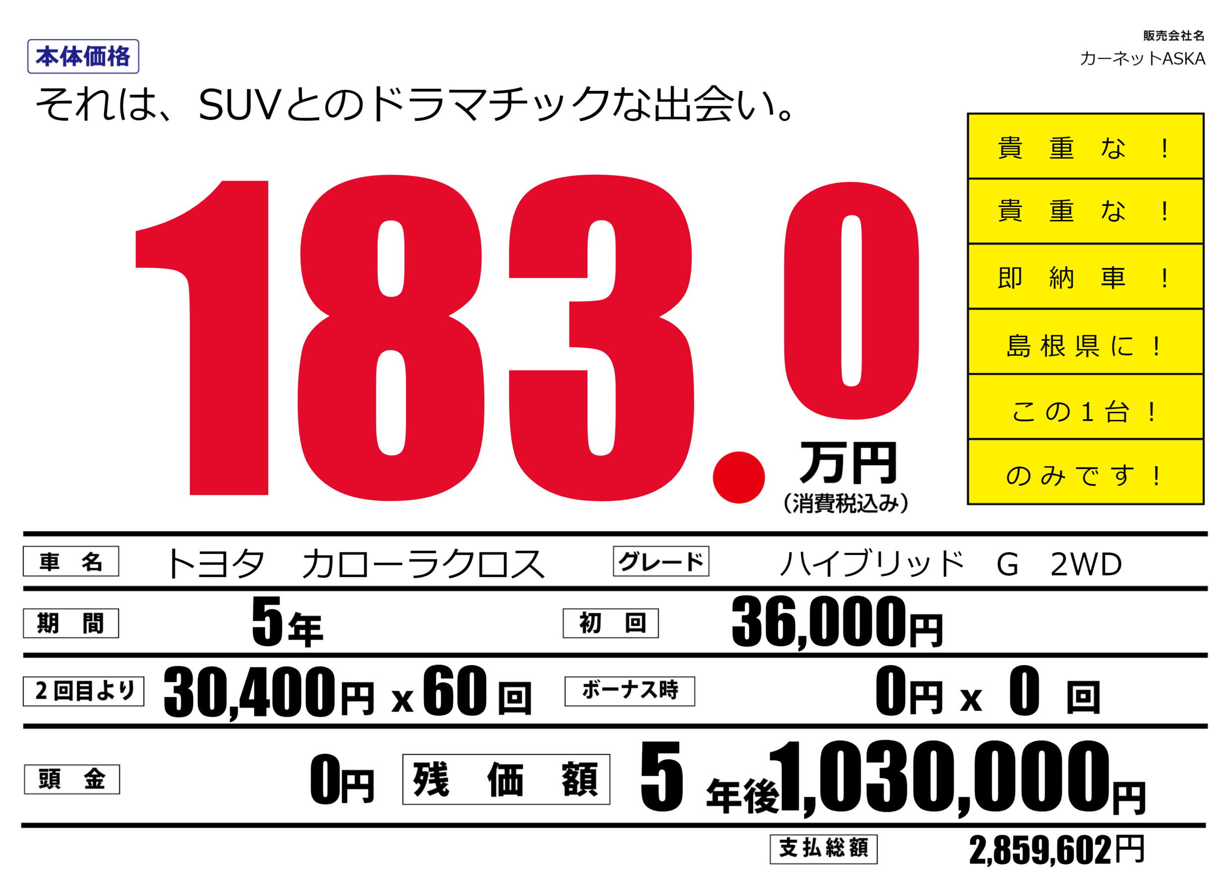 | 車名 | トヨタ カローラクロス | グレード ミッション 排気量 |