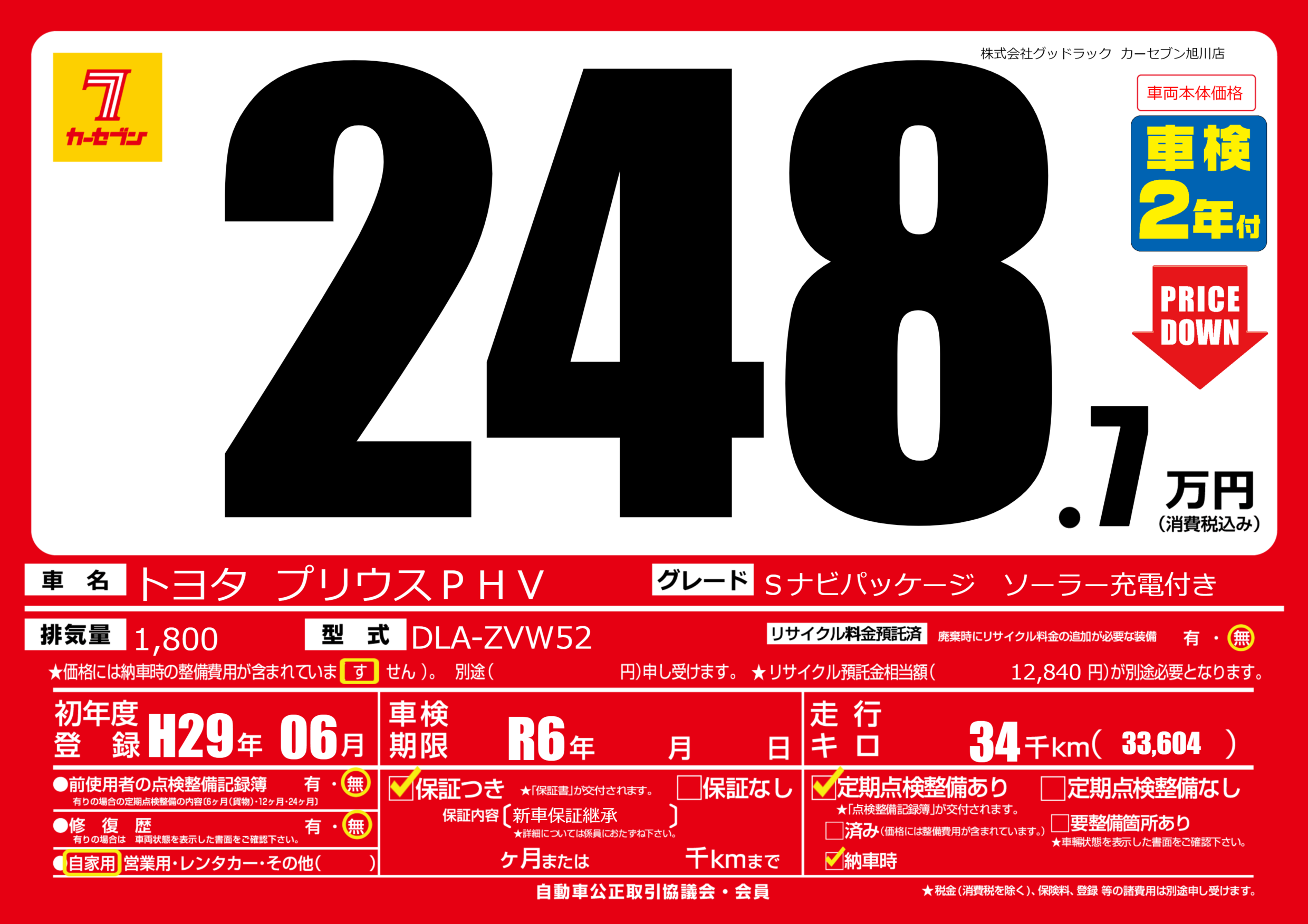 | 車名 | トヨタ プリウスPHV | グレード ミッション 排気量 |