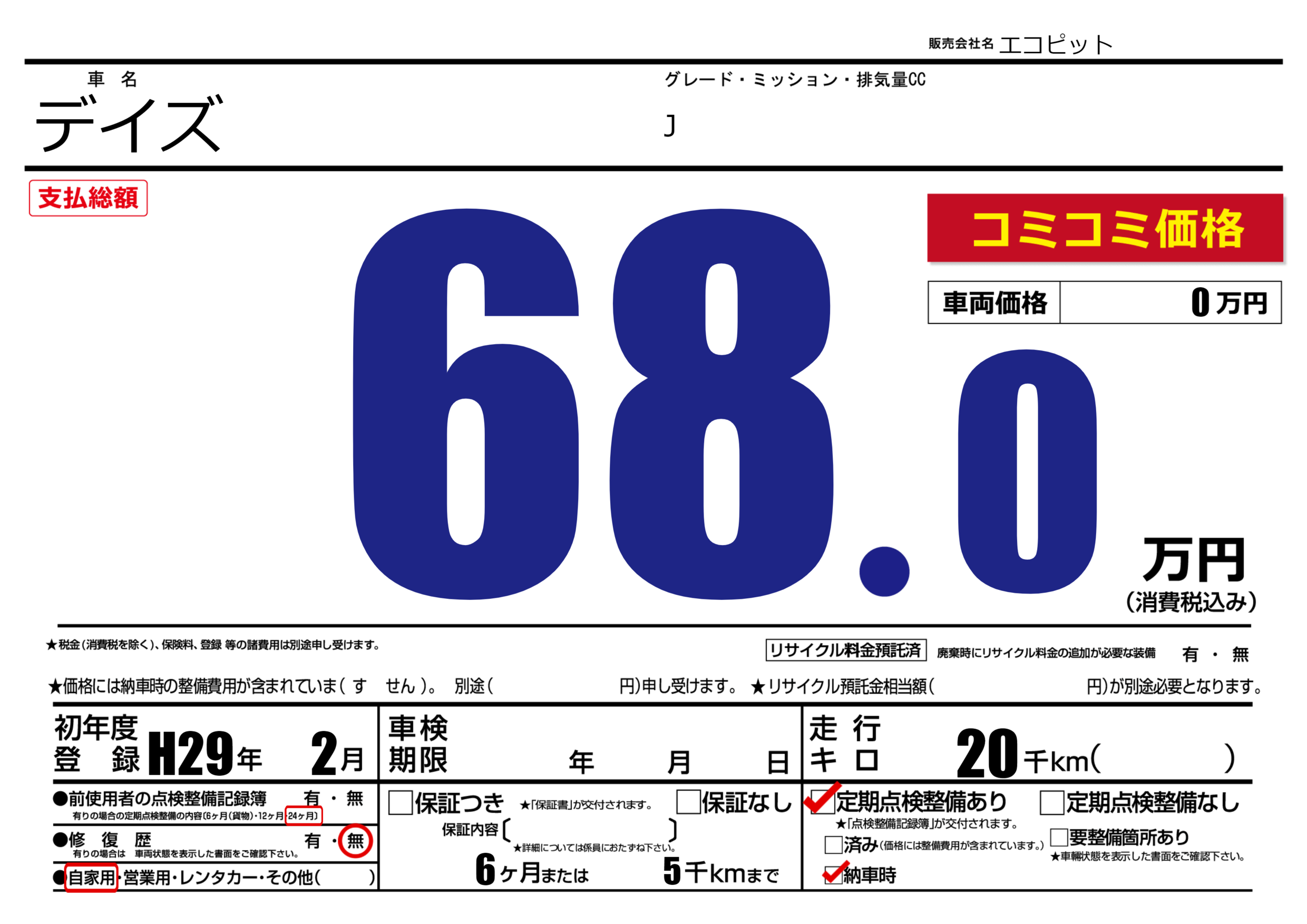 | 定期点検整備 | 定期点検整備あり 納車時あり | ||