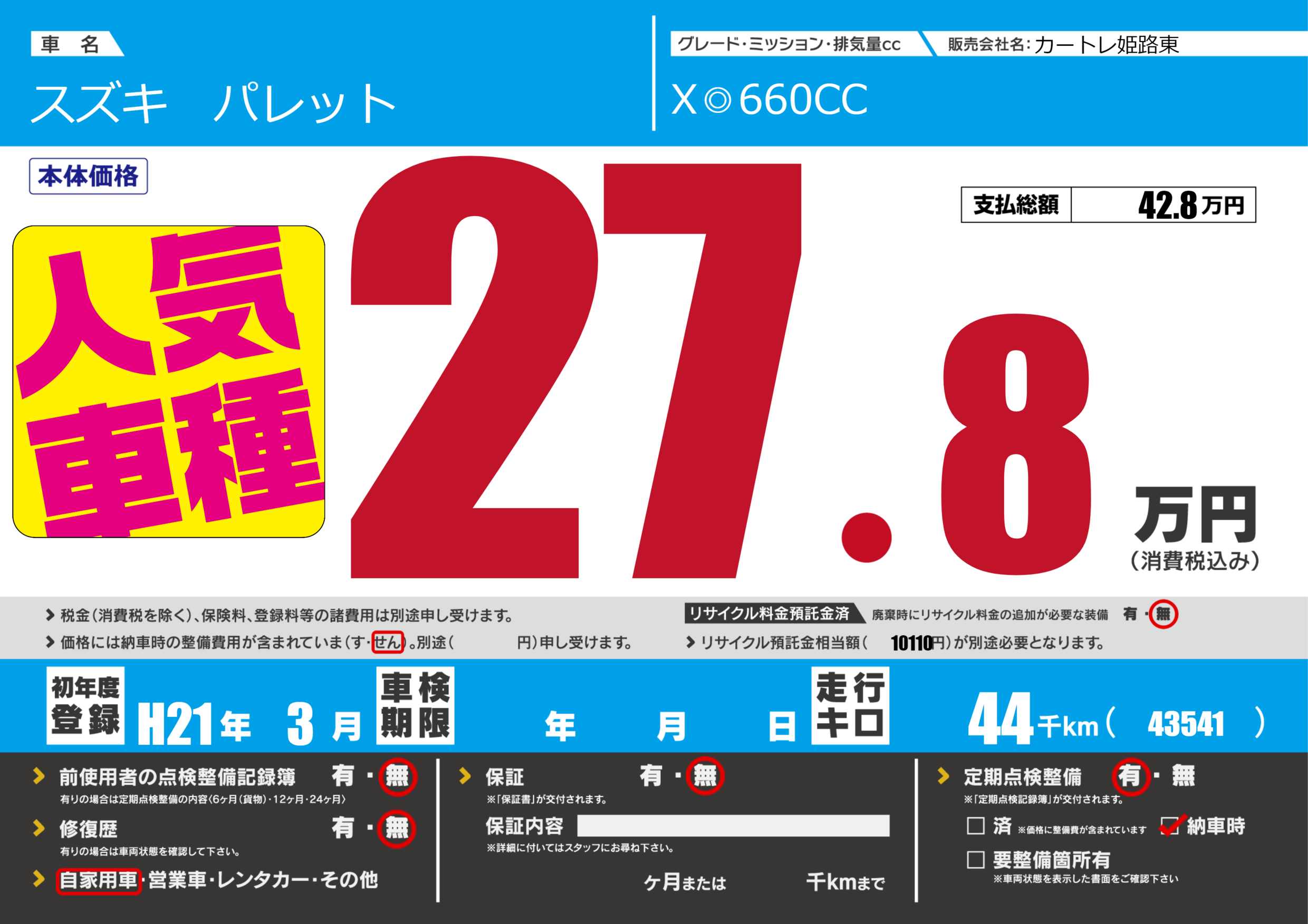 | 走行キロ | 4.4万km | 初年度登録 | H21年3月 |