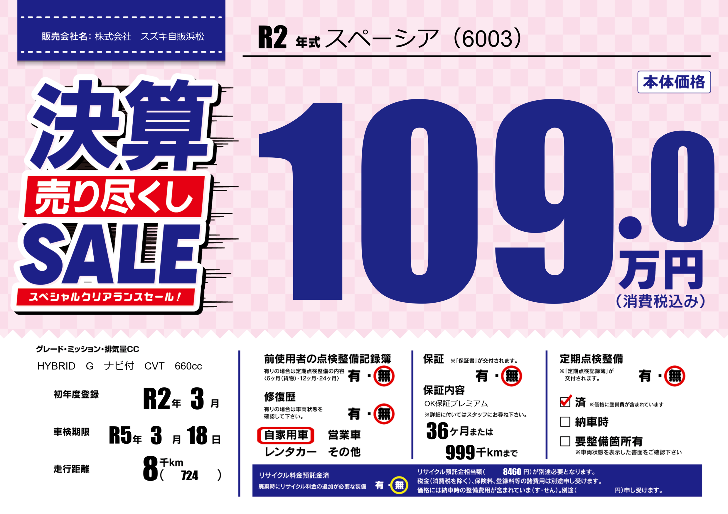 | 車名 | スペーシア(6003) | グレード ミッション 排気量 |