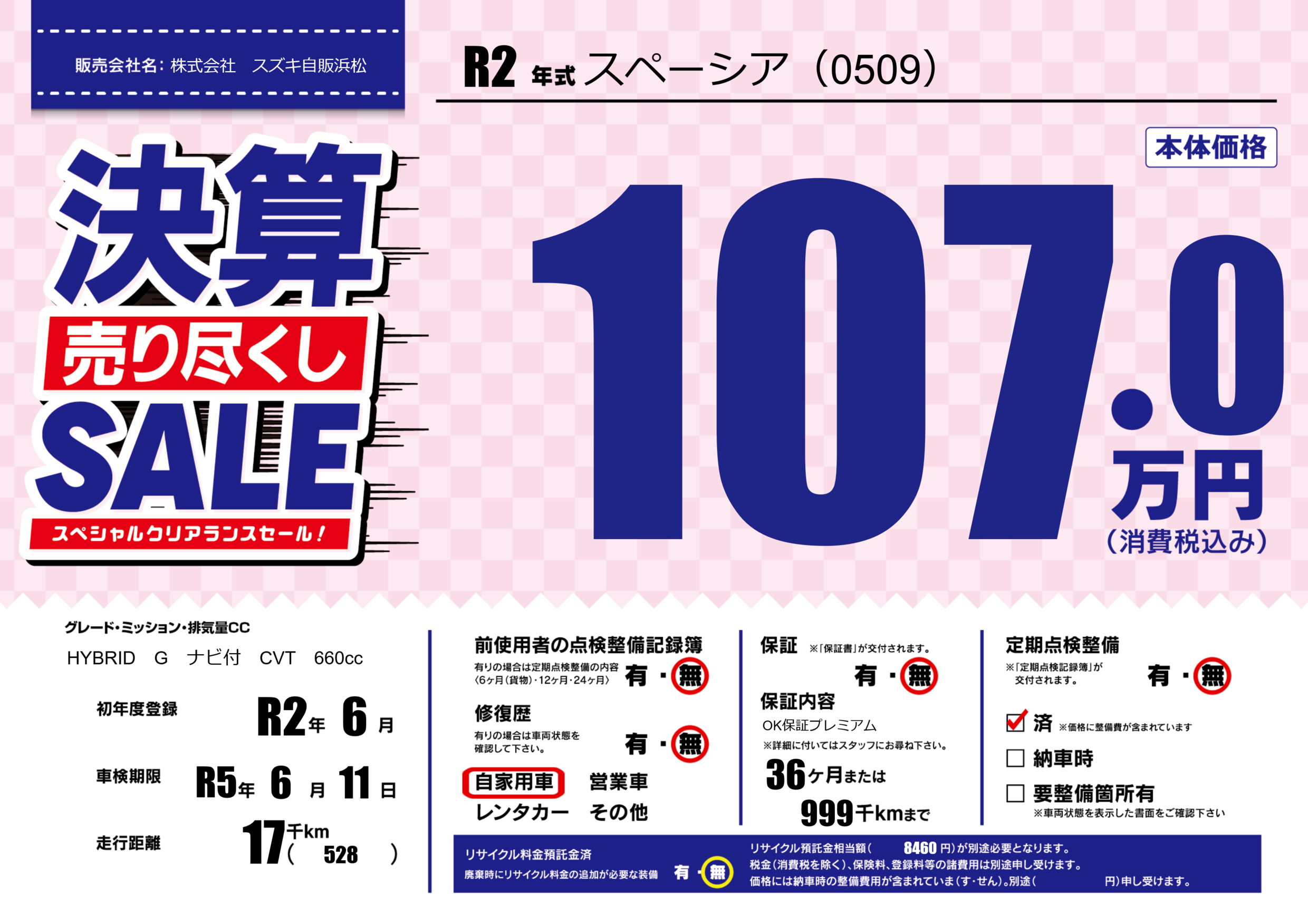 | 車名 | スペーシア(0509) | グレード ミッション 排気量 |