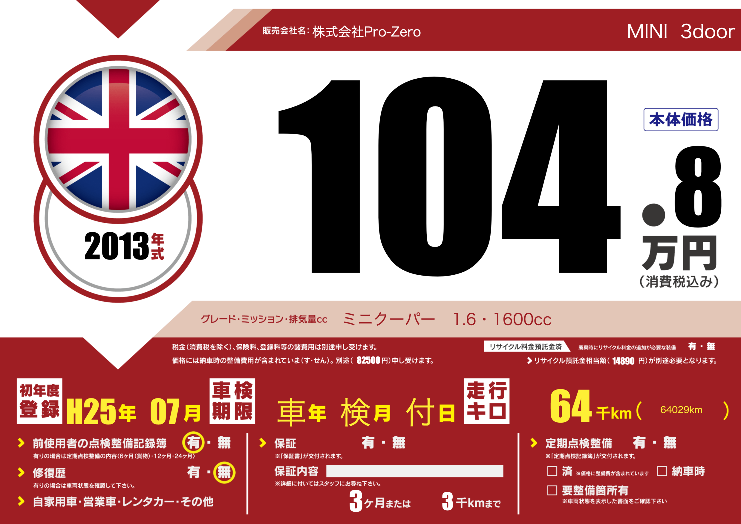 | 車名 | MINI 3door | グレード ミッション 排気量 |