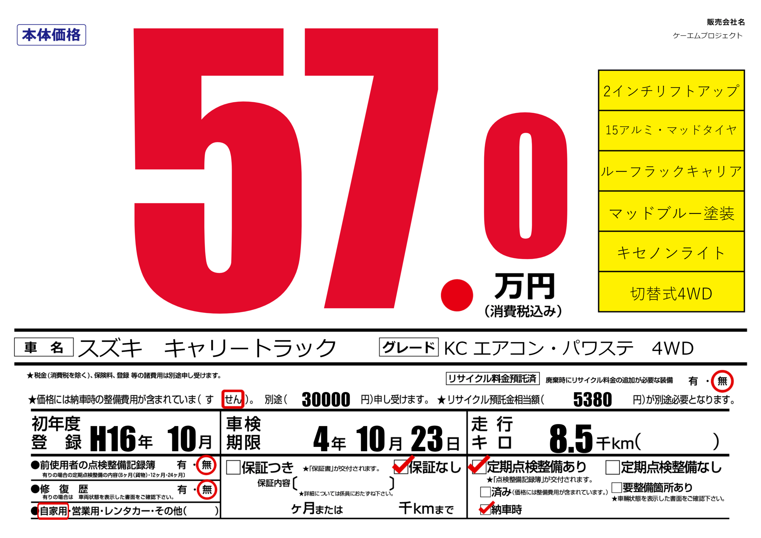 | 車名 | スズキ キャリートラック | グレード ミッション 排気量 |