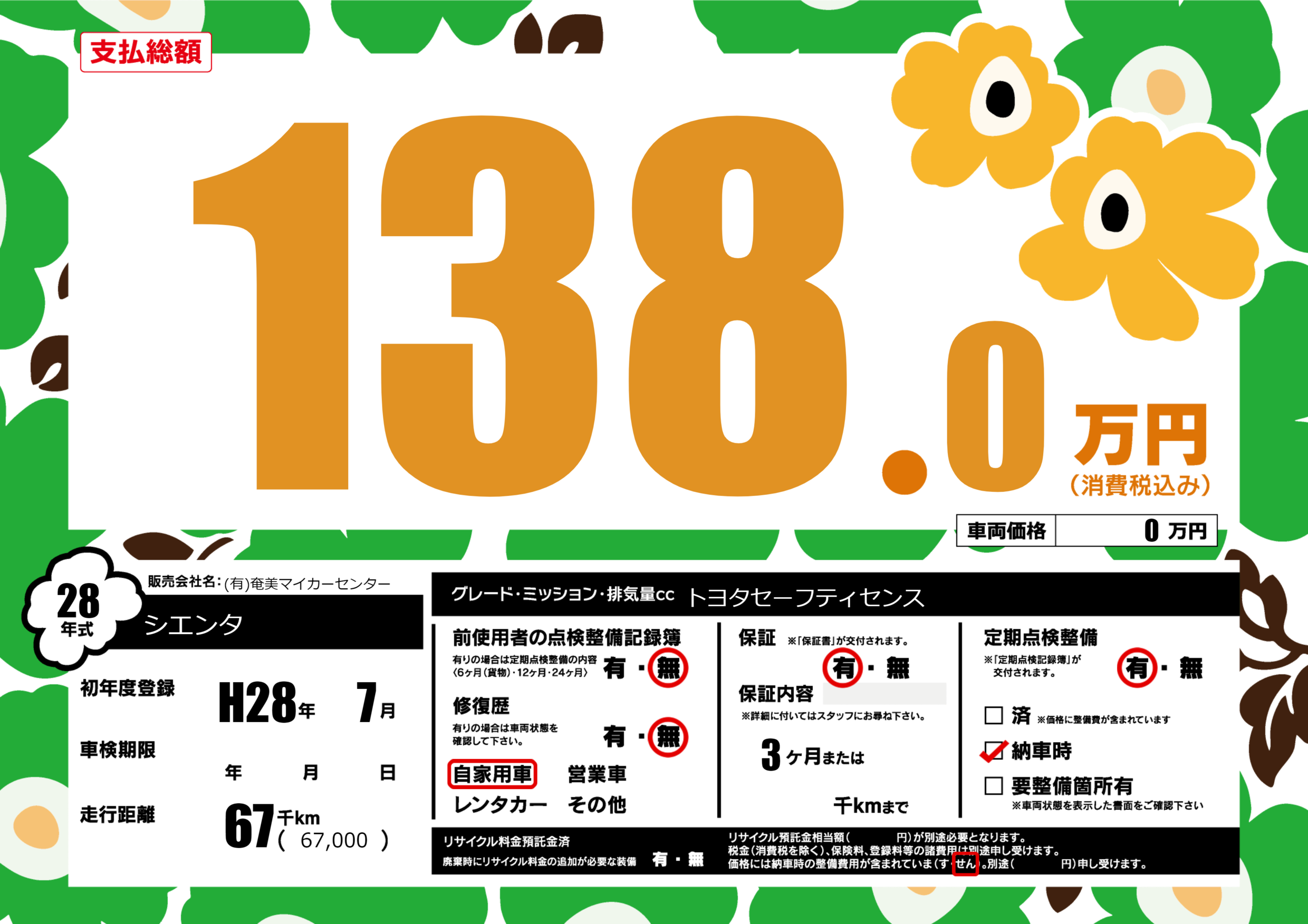 | 車名 | シエンタ | グレード ミッション 排気量 |