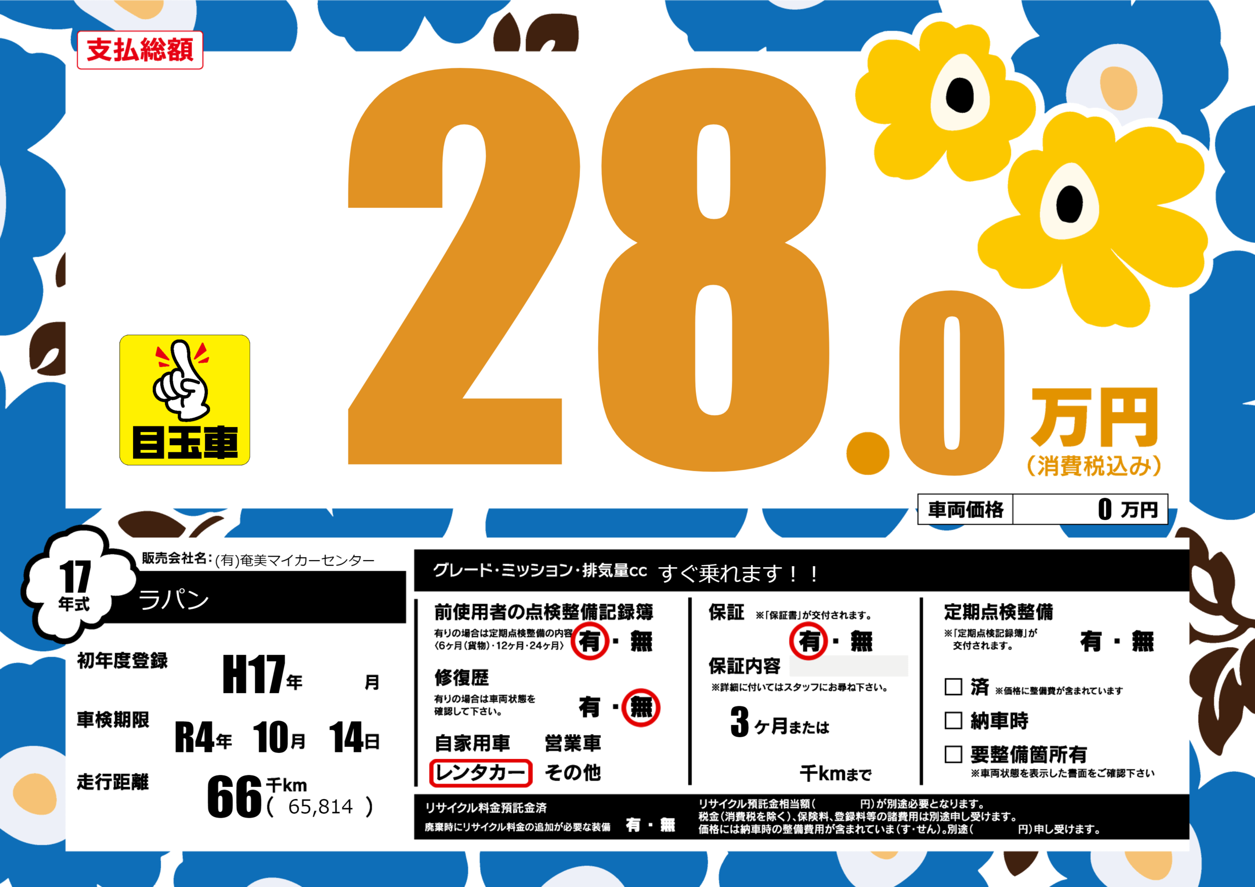 | 走行キロ | 6.6万km | 初年度登録 | H17年---月 |