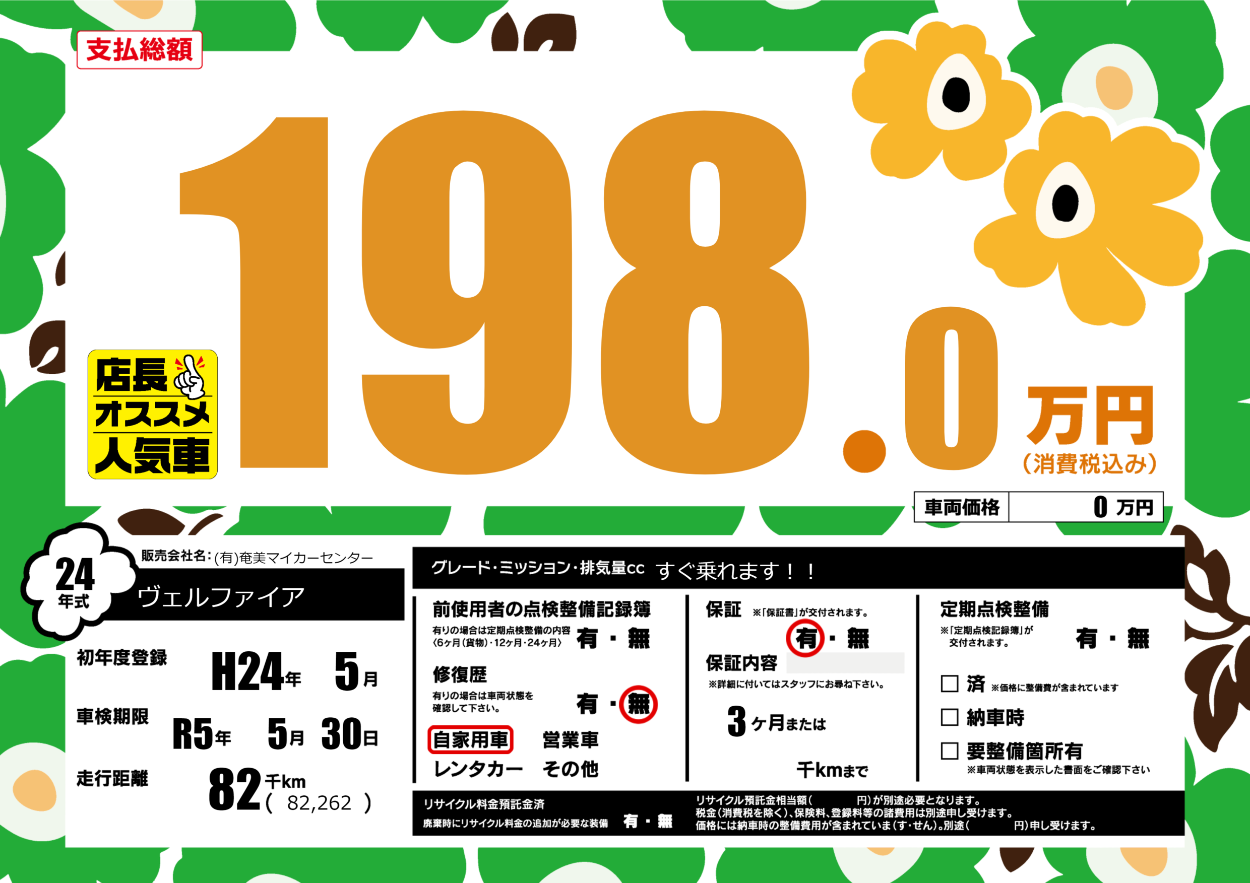 | 走行キロ | 8.2万km | 初年度登録 | H24年5月 |