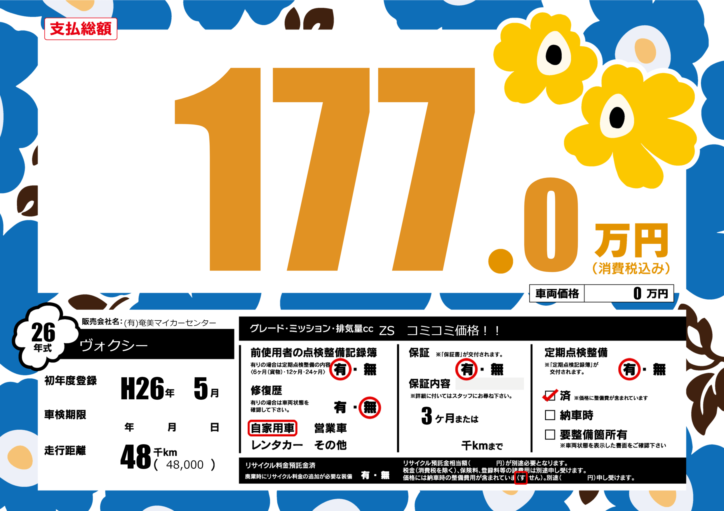 | 走行キロ | 4.8万km | 初年度登録 | H26年5月 |
