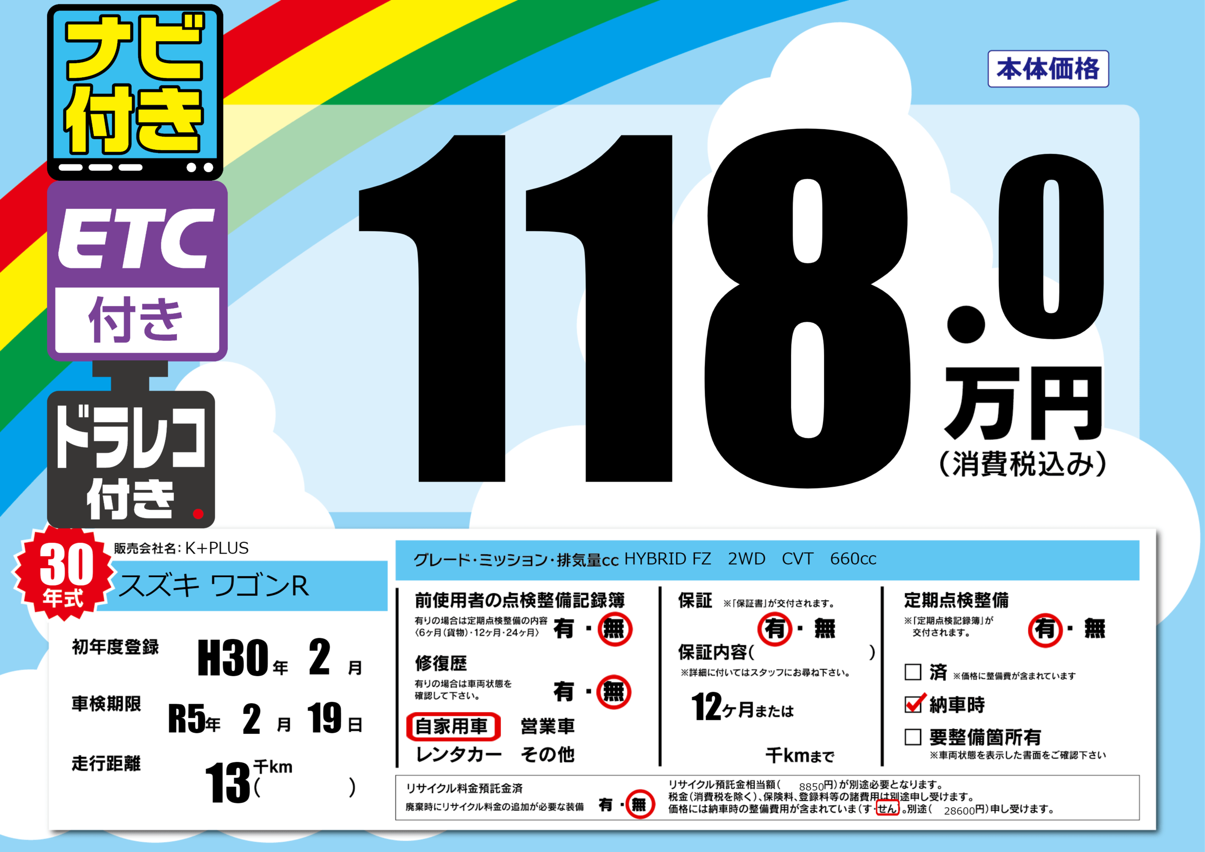 | 走行キロ | 1.3万km | 初年度登録 | H30年2月 |