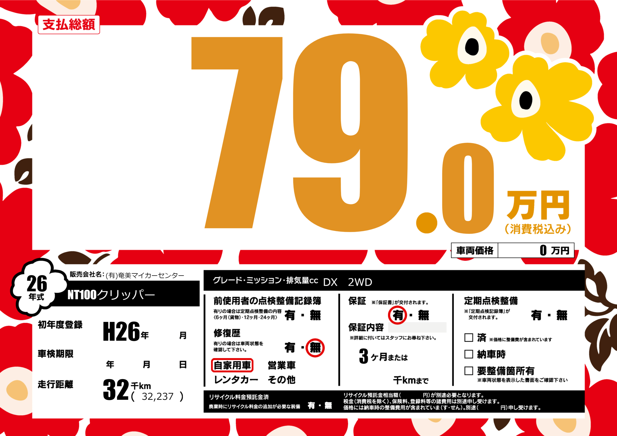 | 走行キロ | 3.2万km | 初年度登録 | H26年---月 |