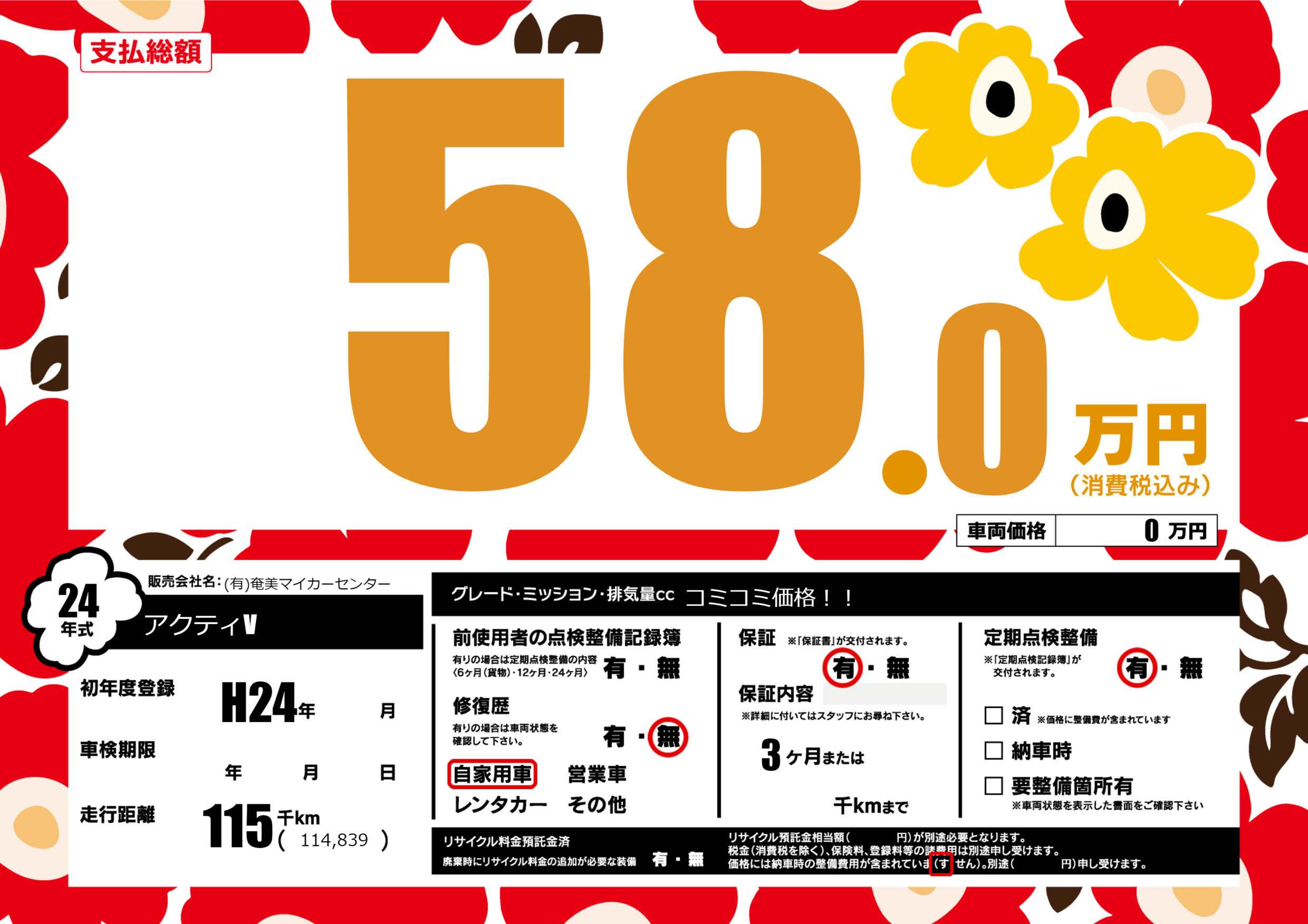 | 車名 | アクティV | グレード ミッション 排気量 |