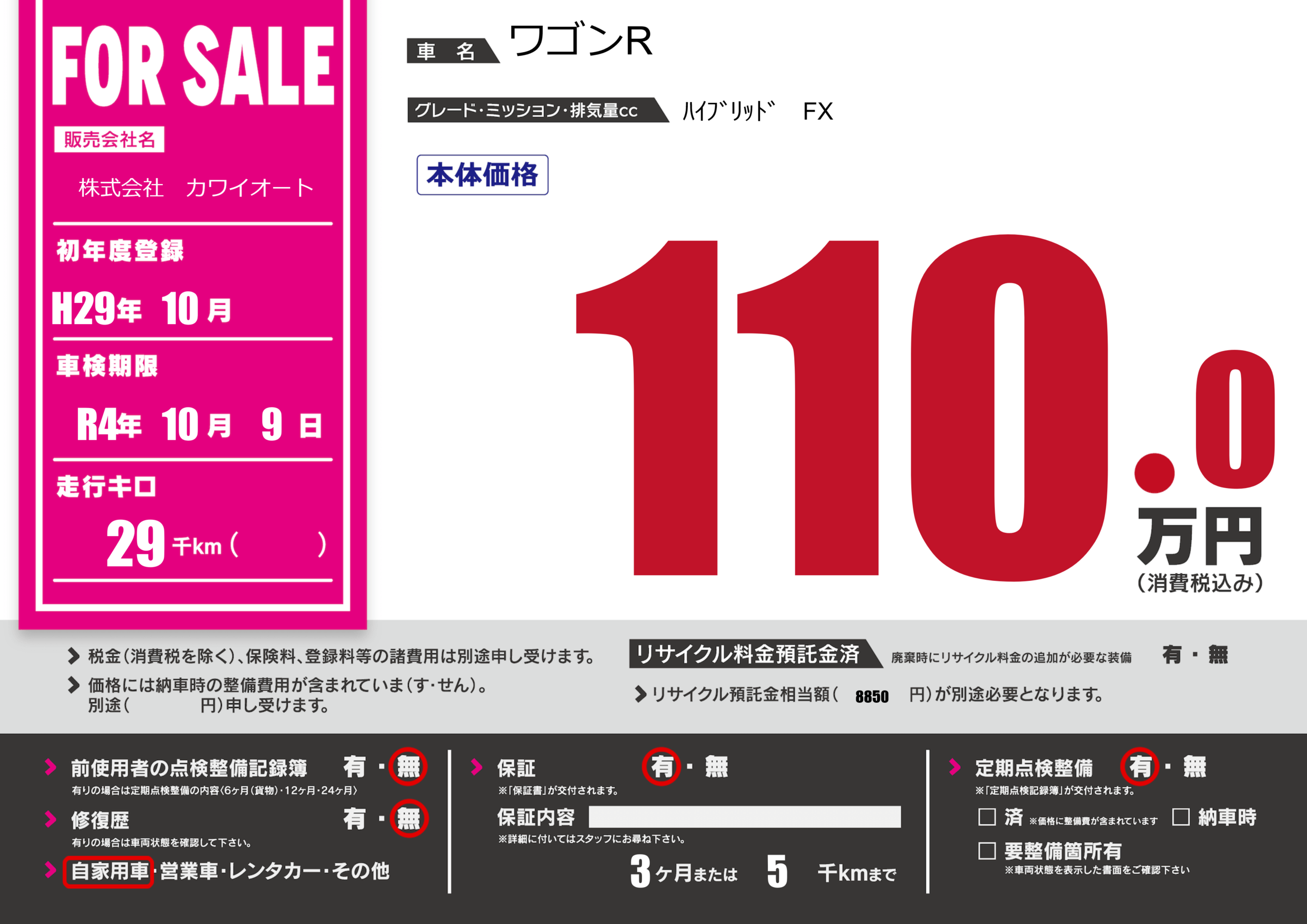 | 車名 | ワゴンR | グレード ミッション 排気量 |