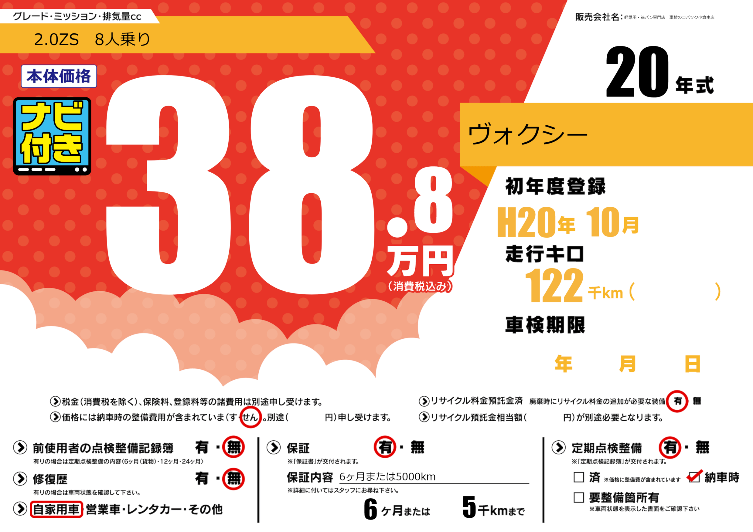 | 車名 | ヴォクシー | グレード ミッション 排気量 |