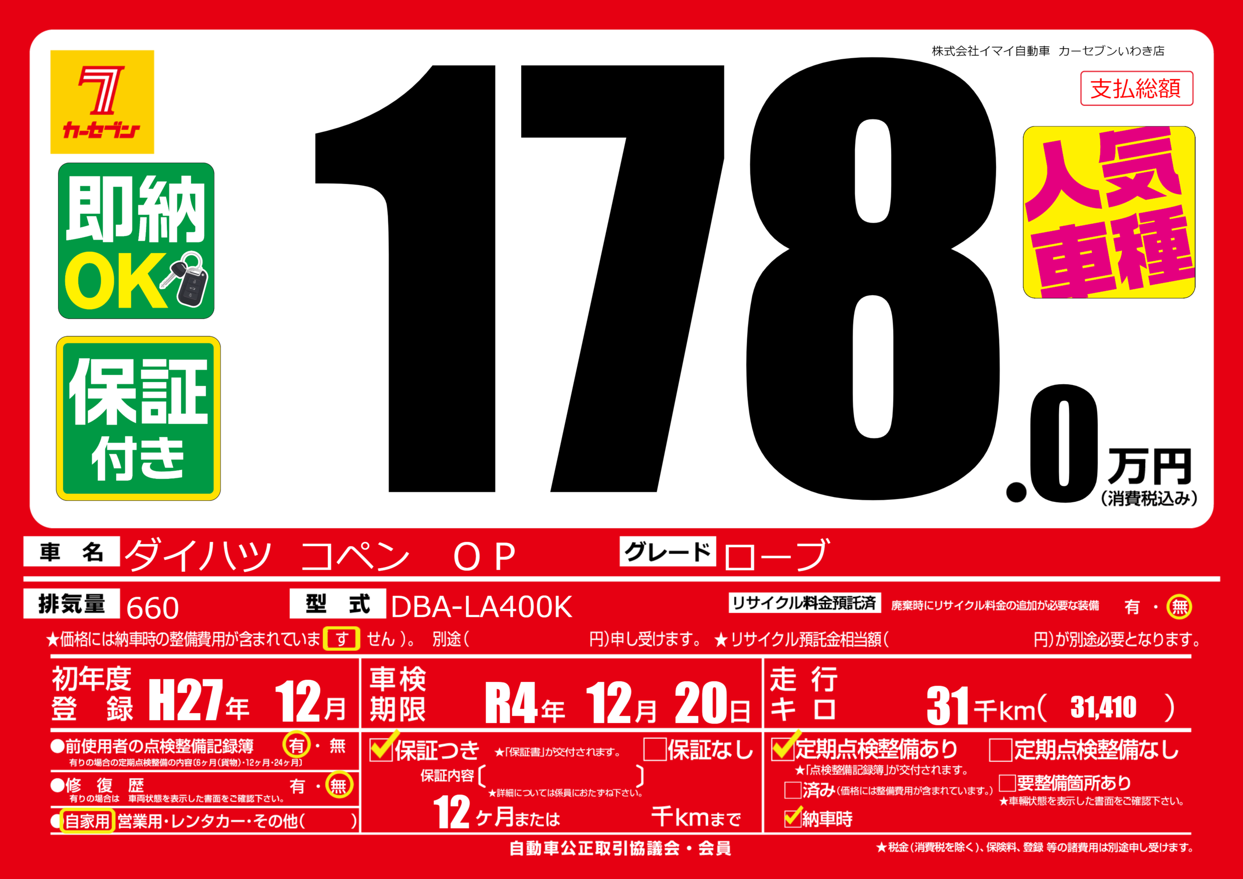 | 車名 | ダイハツ コペン OP | グレード ミッション 排気量 |