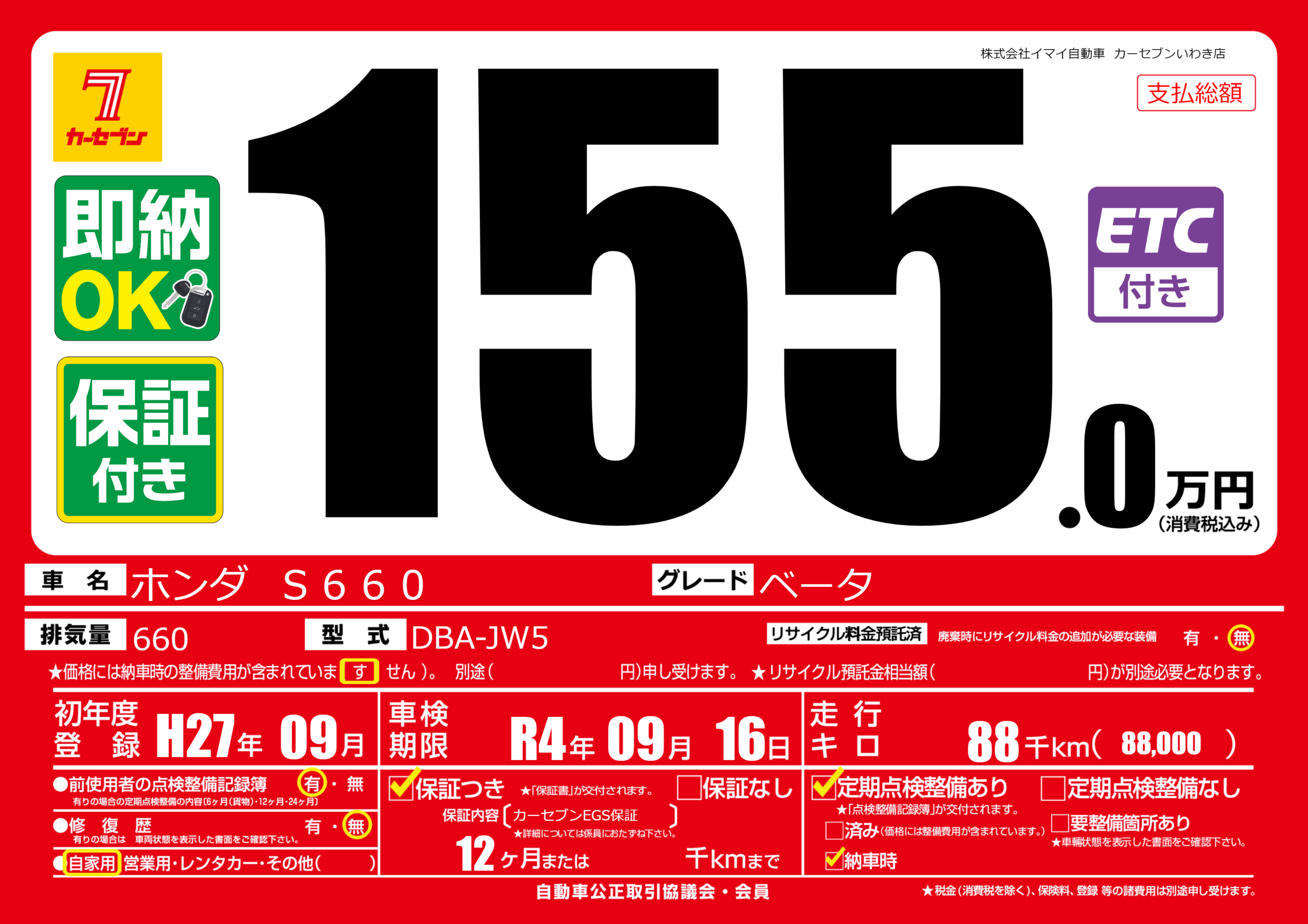 保証付き 保証内容(カーセブンEGS保証) 12ヶ月または千km |