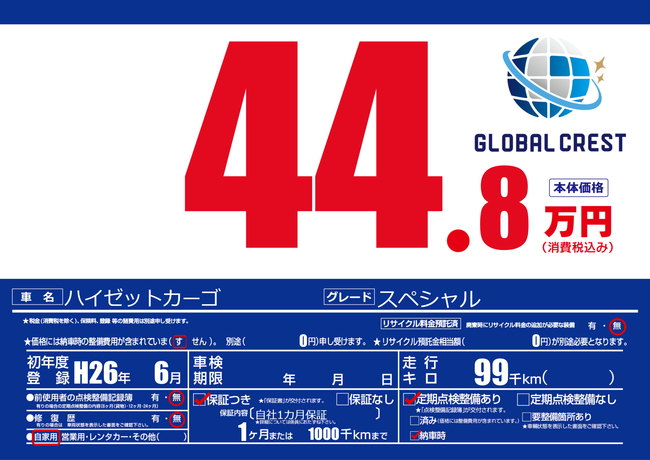 | 車名 | ハイゼットカーゴ | グレード ミッション 排気量 |