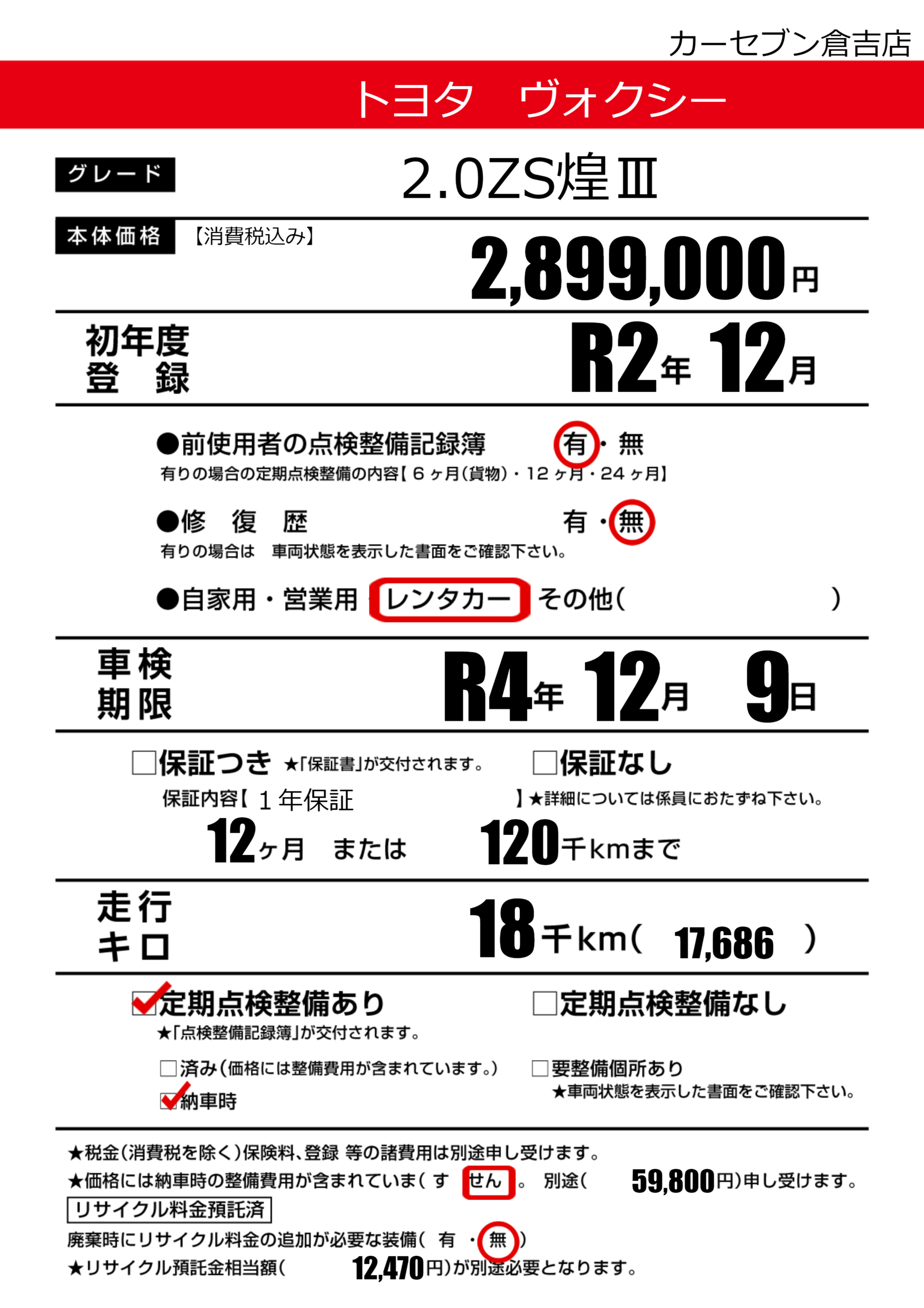 | 定期点検整備 | 定期点検整備あり 納車時あり | ||
