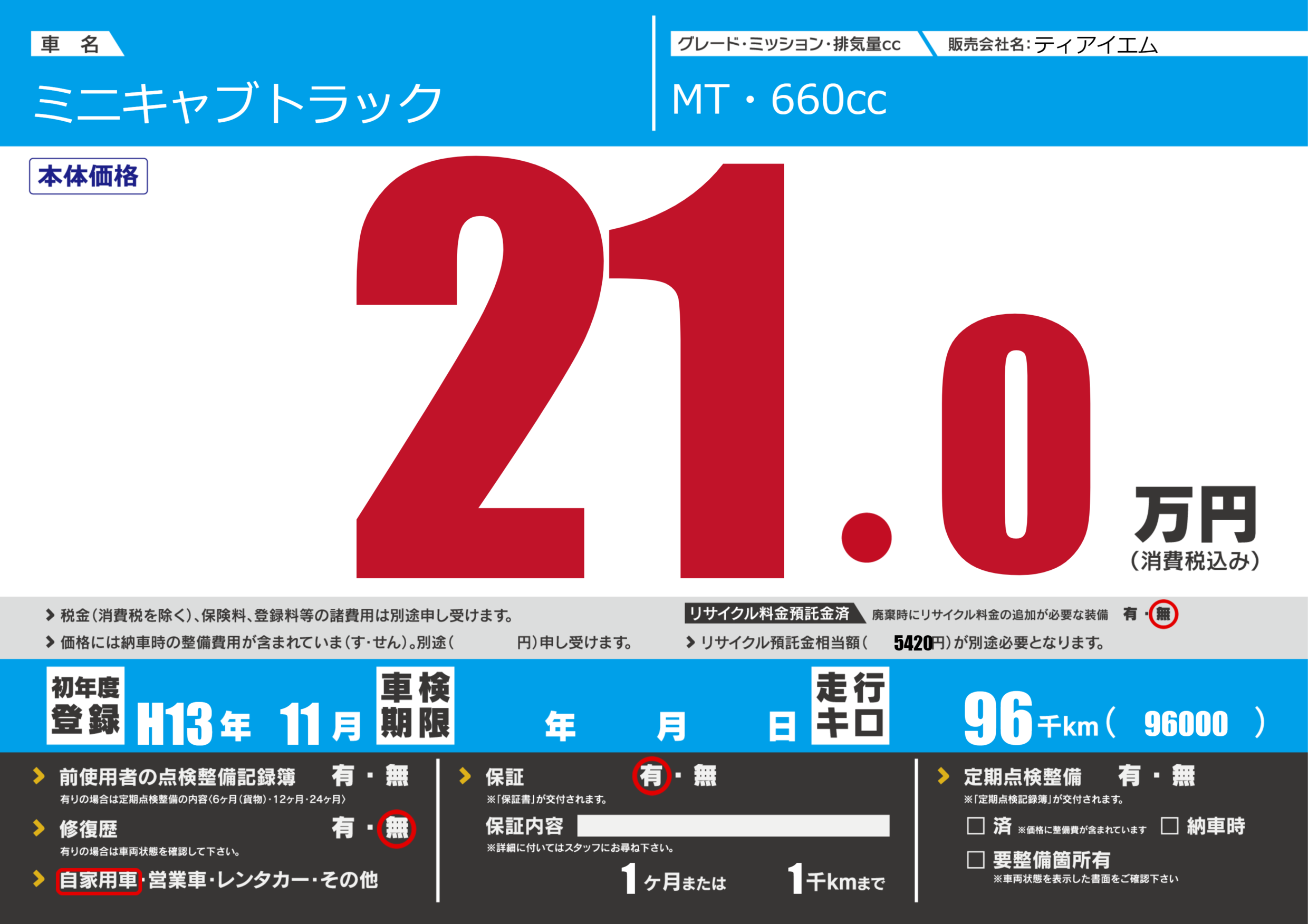 | 車名 | ミニキャブトラック | グレード ミッション 排気量 |